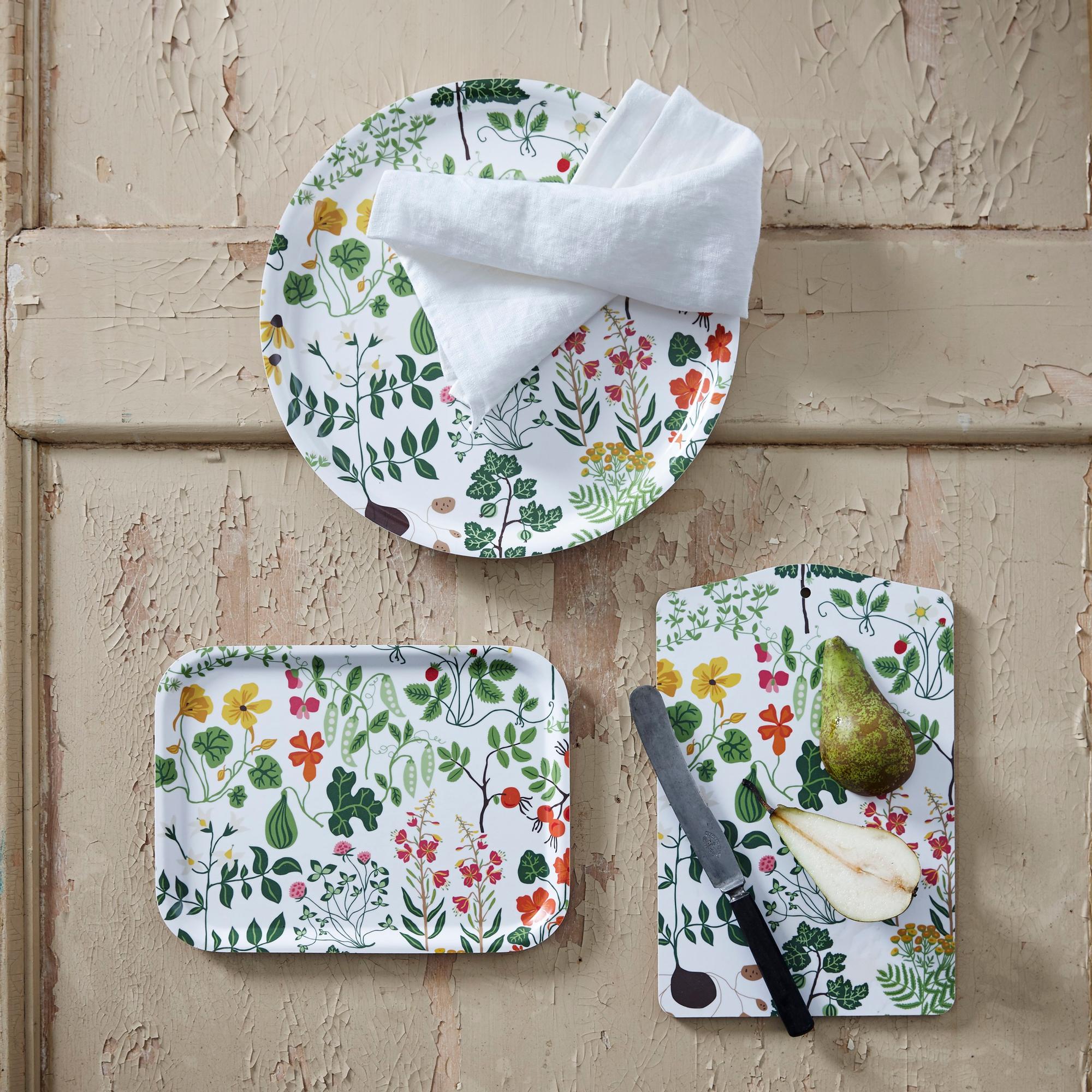 Mökillä tarvitaan liuta tarjottimia, joilla kiikutetaan ruot ja juomat terassille. Tämä Klippan Yllefabrikin kukallinen tarjotin käy myös tarjoiluastiasta. Mansikkakakku näyttää herkulliselta niittykukilla kuvioidulla tarjottimella.