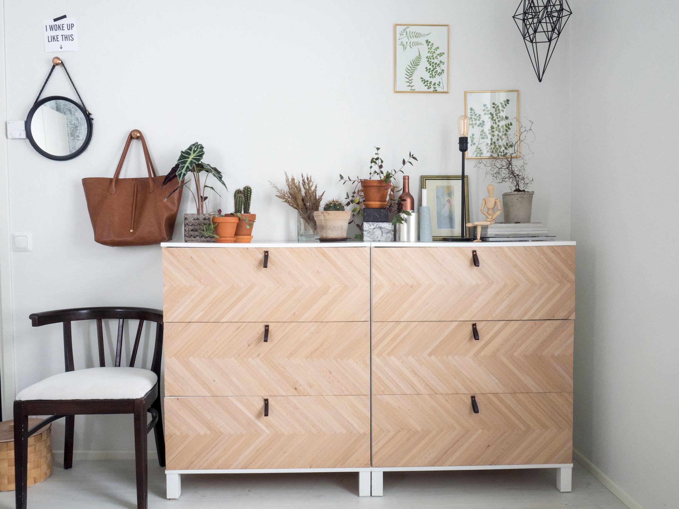 Tässä Ikean lipastossa oli alun perin läpinäkyvät ikkunat, jotka asukas halusi piiloon. Hän hankki rautakaupasta ison pussillisen sytytystikkuja kuudella eurolla ja liimasi ne puuliimalla ovien pintaan kalanruotokuvioon. Reunoista hän siisti ylimääräiset palat pois pistosahalla. Vetimet on tehty kirpputorilta löytyneestä vyöstä, jotka on ruuvattu laatikoihin. Lue lisää lipaston muodonmuutoksesta täältä!