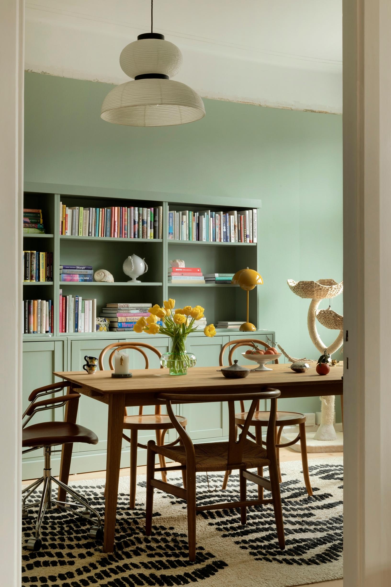 Somevaikuttaja Eeva Kolu loi kotiinsa kahvilamaisen salongin, joka on yhdistetty ruokailuhuone ja kirjasto. Sen pääosassa on kirjahylly, joka on tuunattu itse Ikean avohyllyistä ja ovellisista kaapeista, joita Eevalla oli jo hänen edellisessä kodissaan. Kokonaisuus nivoutuu yhteen, kun se on maalattu samalla vihreän sävyllä kuin seinä.