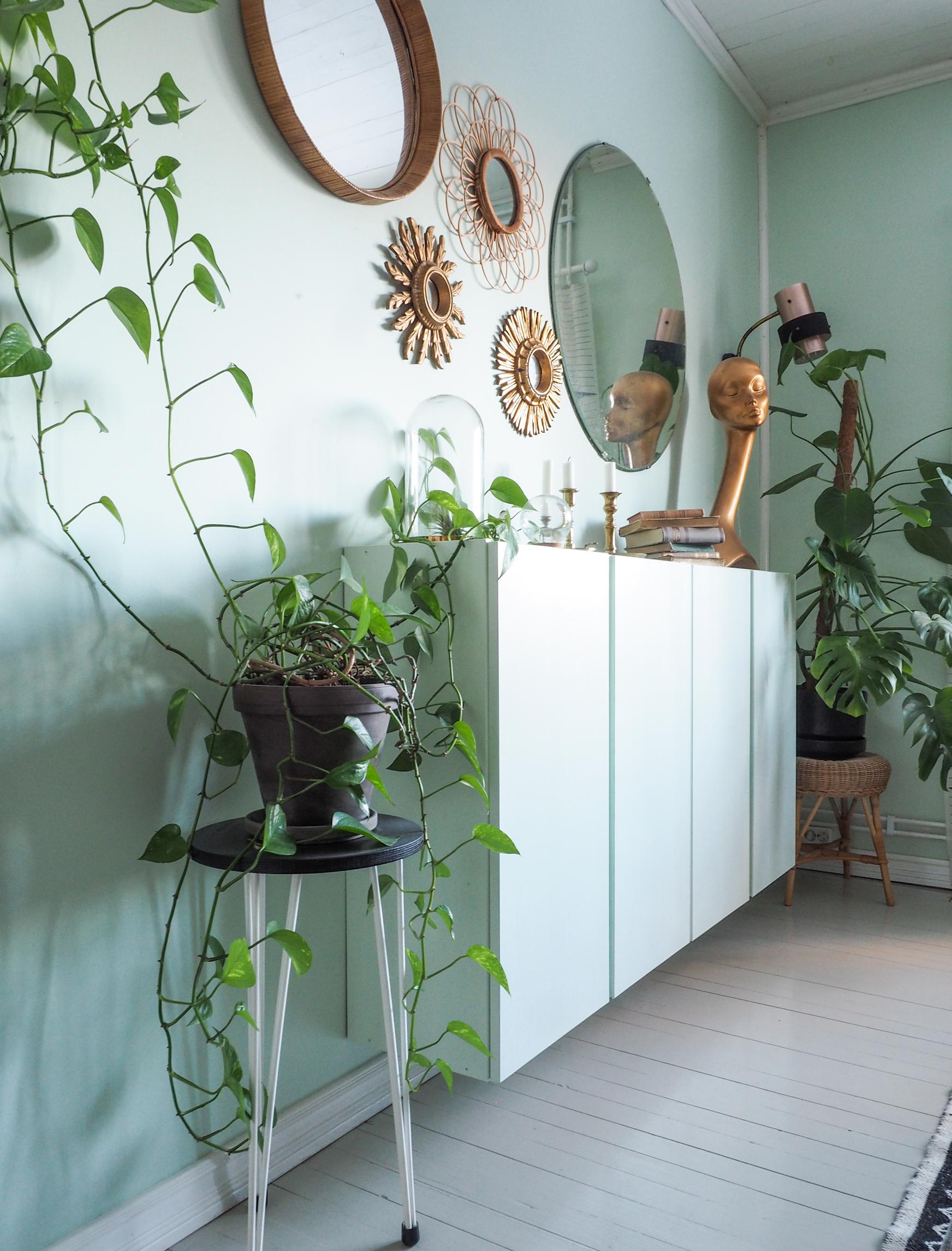 Niin ihana kuin luonnonvärinen Ivar olikin, se ei sopinut yhteen huoneen muiden puupintojen kanssa. Maalasin kaapit tapetteihin sointuvaksi ja ruuvasin seinälle. Maalina oli liuotinpohjainen pohjamaali ja päälle tuli Tikkurilan Nefriittiin sävytetty puolikiiltävä Futura 40.