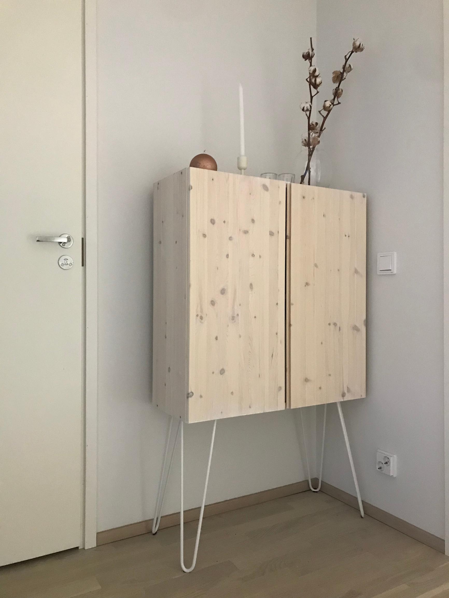 Vahasin kaapin Osmo Colorin kuusen sävyisellä puuvahalla ja kiinnitin siihen Prettypegsiltä tilaamani metallijalat. Tykästyin tähän ideaan helppouden ja persoonallisuuden takia. Pidän siitä, että kaapissa näkyy oma kädenjälkeni, ja siitä, että tuunaamalla sain juuri haluamani lopputuloksen. Tuunaaminen oli helppoa!” – Noora Terkomaa