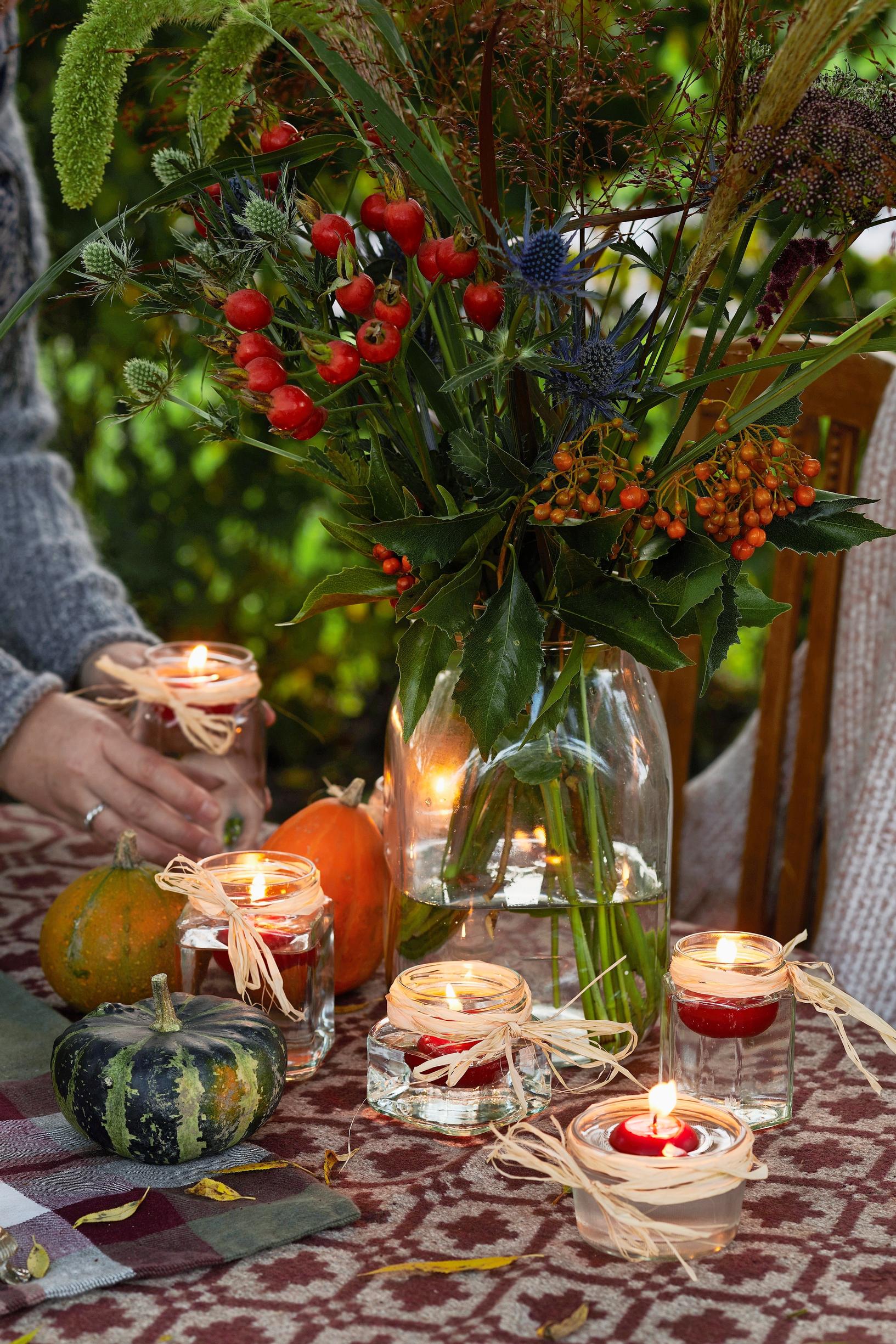 Somista isolla liinalla verhottu pöytä esimerkiksi koristekurpitsoilla, munakoisoilla tai pulleilla luumuilla. Asettele pöytään lasipurkeissa kelluvat kynttilät. Solmi kynttiläpurkit paperinaruruseteilla ja kerää komea kimppu suureen lasitölkkiin.