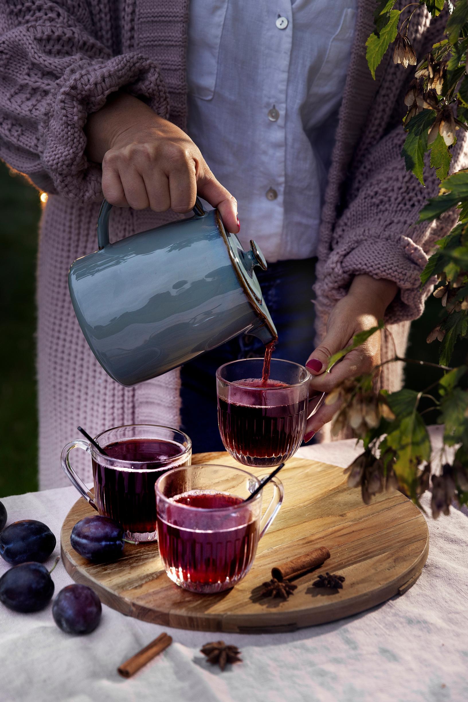 Alkumaljat on kiva kilistellä kuohuvalla, mutta mausteinen juoma lämmittää ihanasti illan viiletessä. Keitä makusiirappi puolesta kilosta luumuja ja 3 desilitrasta sokeria. Kaada pullollinen punaviiniä kattilaan. Lisää pari kanelitankoa, 3 tähtianista, 10 neilikkaa ja pala inkivääriä. Mausta siirapilla. Kuumenna juoma höyryävän kuumaksi ja anna hautua. Siivilöi ennen tarjoamista.