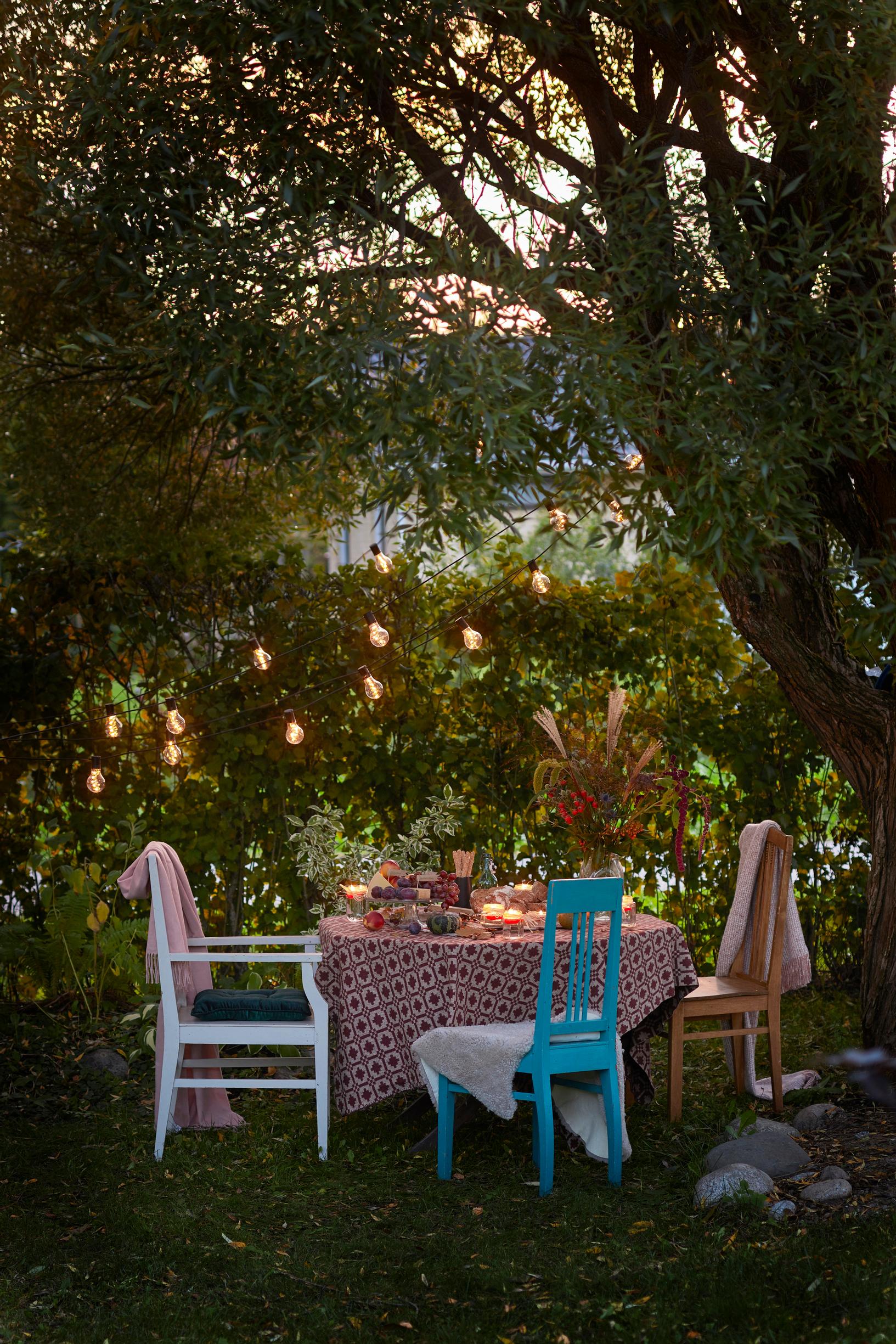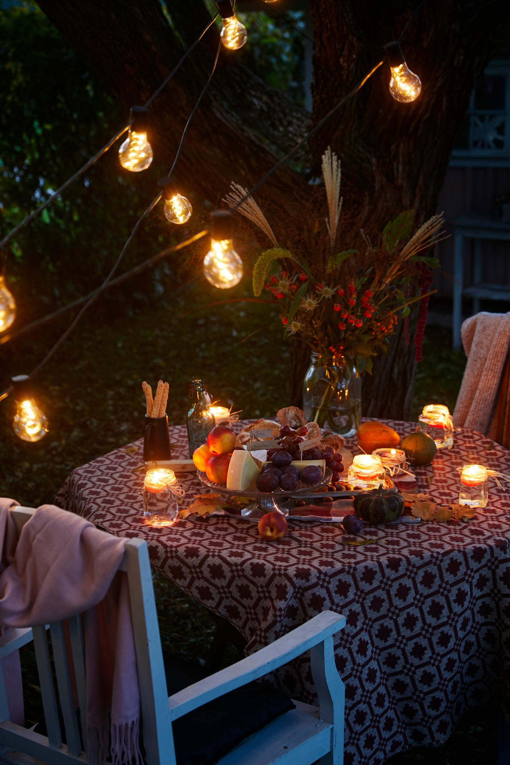 Kutsu ystävät nauttimaan hämärtyvistä, lämpimistä illoista. Ikimuistoinen tunnelma syntyy helposti: koristele piha tuikkivilla valoilla, kata rentoa naposteltavaa ja luumuviiniä sekä nosta tuoleille lämpimät viltit.