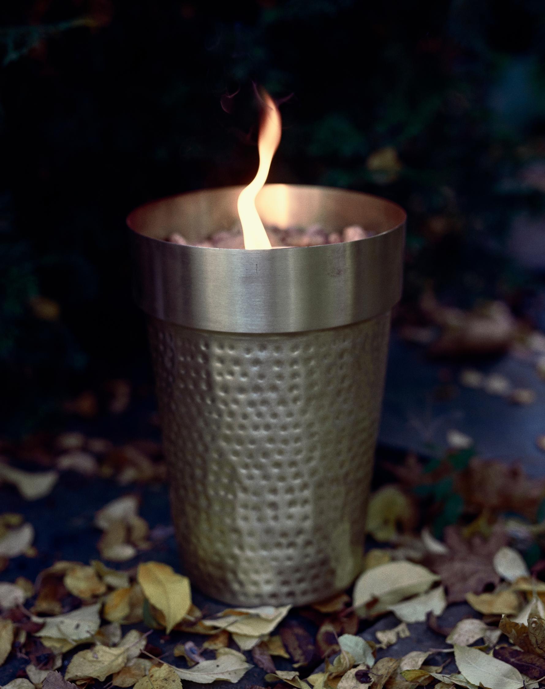 Tee ulkotuli täyttämällä keraaminen tai metallinen ruukku kivillä lähes täyteen ja upota keskelle ulkotuli. Täytä ruukkua vielä niin, että ulkotulen ja kivien pinta ovat samassa tasossa.