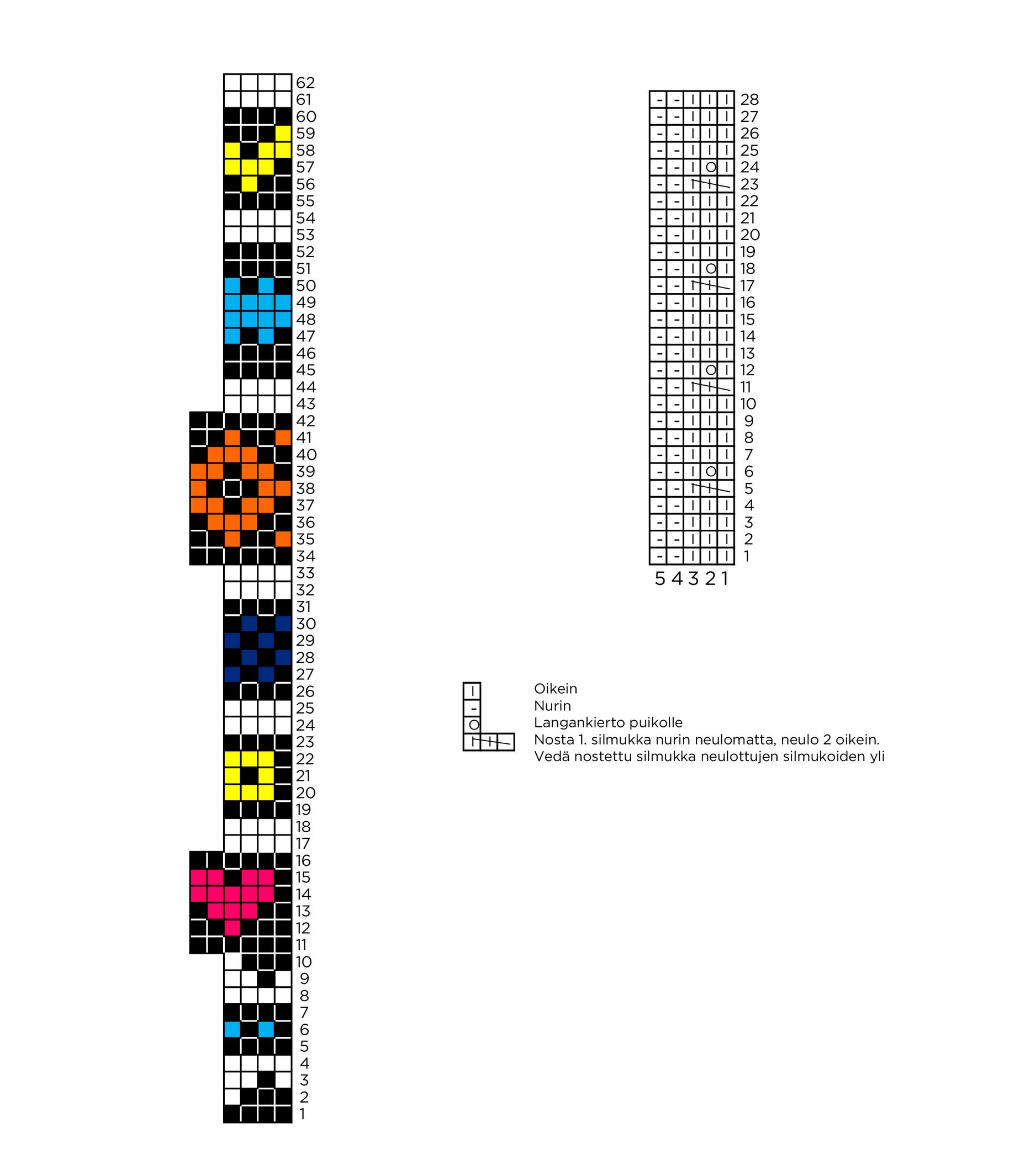 5. Neulo kuviot kaavion mukaan. Päävärit musta ja valkoinen kulkevat takasaumassa koko työn ajan.