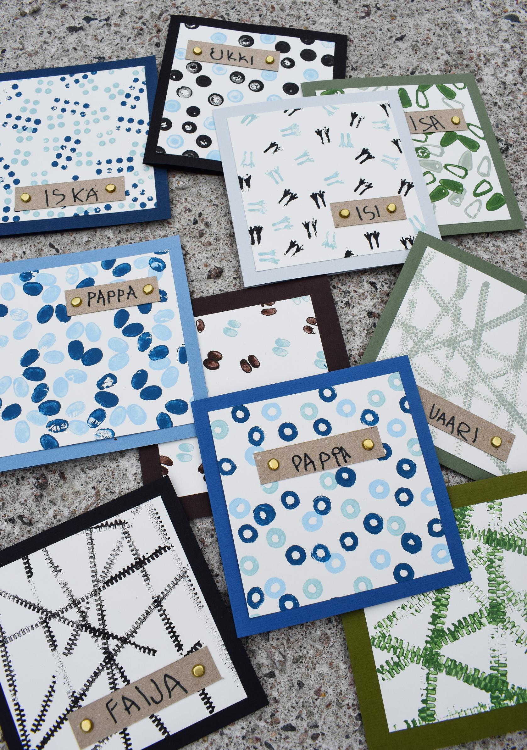 Isänpäiväkortti valmistuu pikkuisiltakin aikuisen tai isomman sisaruksen avustuksella. Ohjeillamme syntyy persoonallisia kortteja, joiden kuviot tehdään vaikka muovisilla leluilla ja marmorikuulilla.
