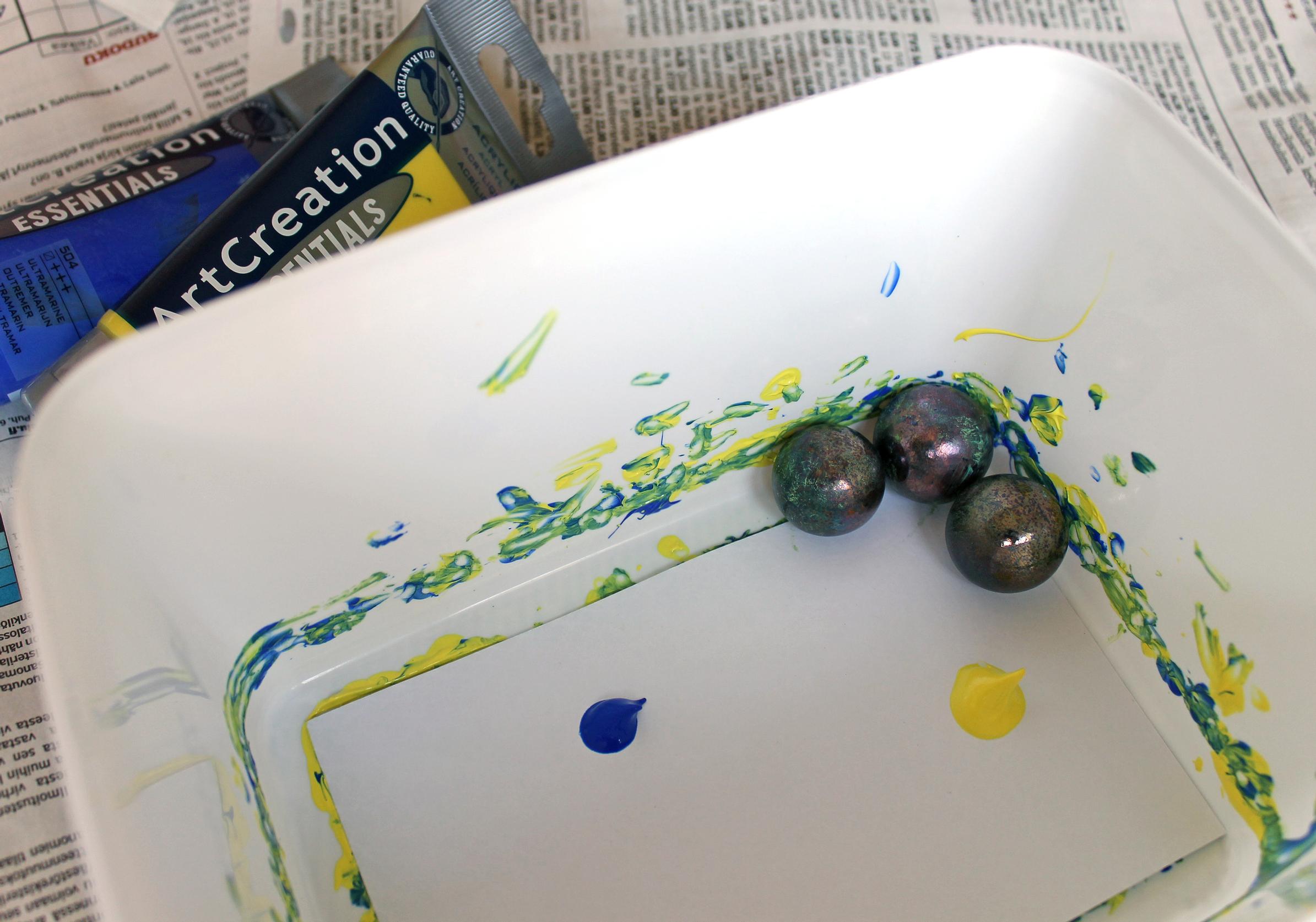 3. Laita rasiaan muutama marmorikuula ja sulje kansi. Heilauta rasiaa puolelta toiselle, jotta kuulat levittävät väriä joka puolelle paperia.