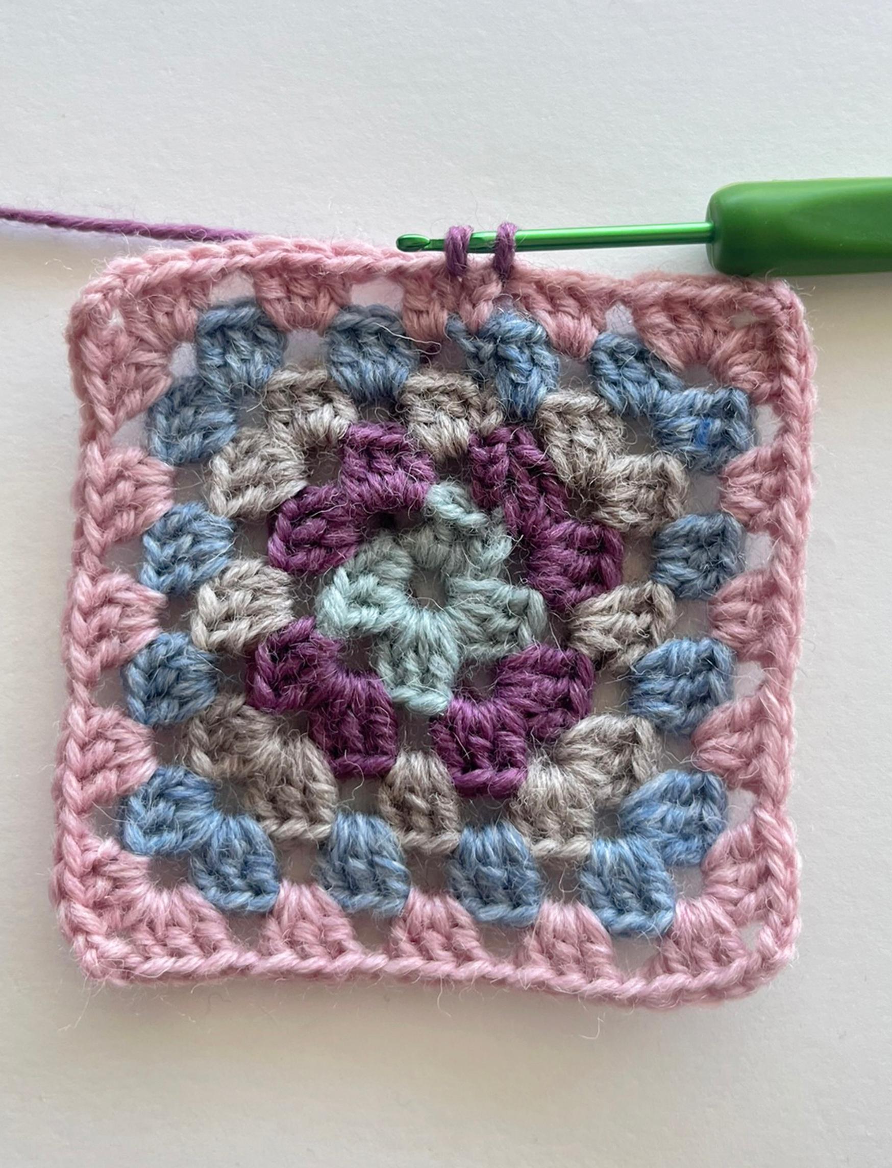 7. Virkkaa vielä 6. kerros, jolla viimeistelet isoäidinneliön reunat kiinteillä silmukoilla (ks). Virkkaa jokaiseen silmukkaan ks ja kulmiin 3 kjs. Voit käyttää samaa tai eri väriä kuin edellisellä kerroksella.