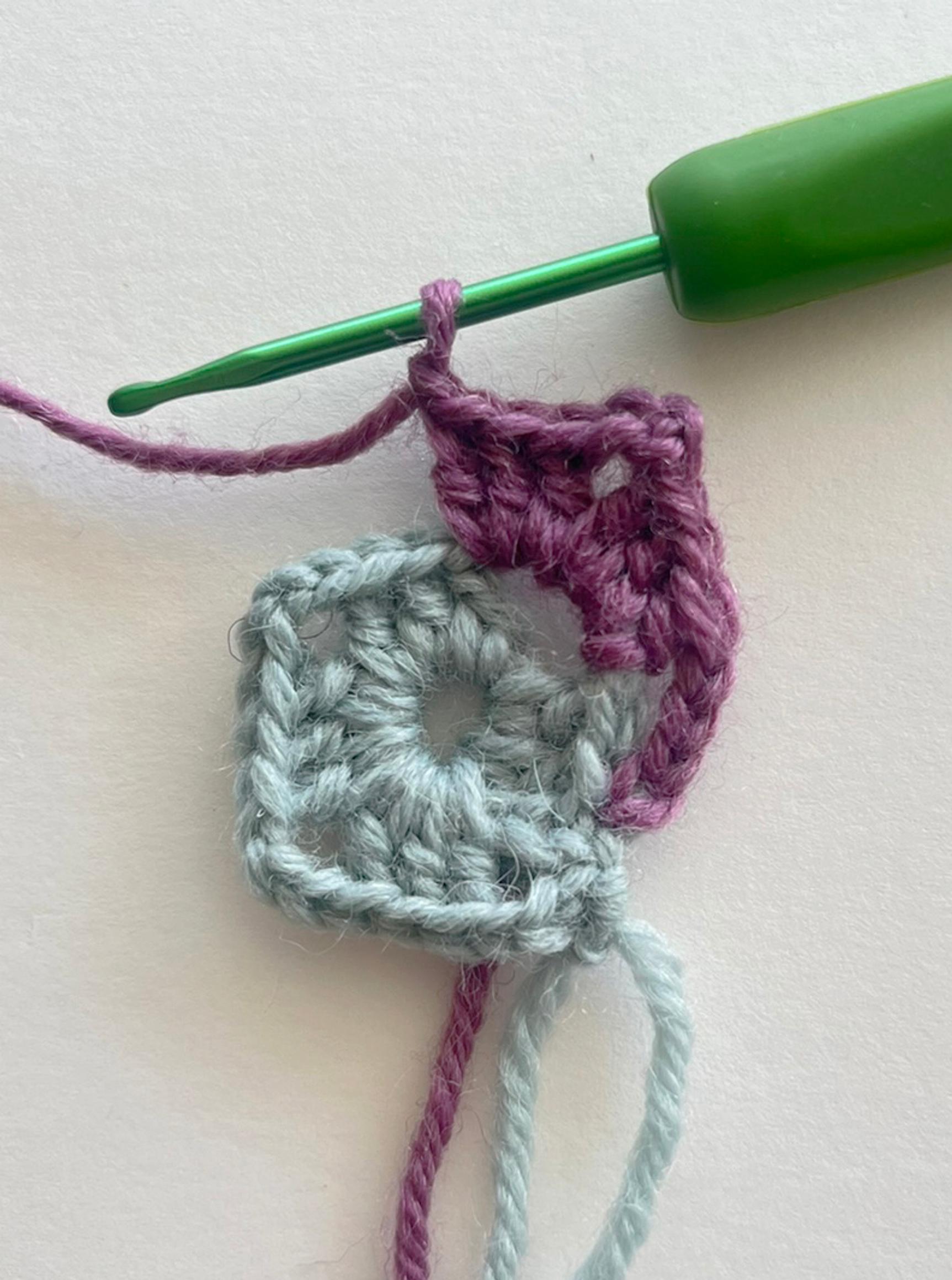 5. Vaihda väriä ja virkkaa 4. pylväskerros: Tee ensin 4 ketjusilmukkaa. Virkkaa seuraavasta reiästä alkaen tavalliseen tapaan eli neliön sivun reikiin 3 pylvään ryhmä, väleihin 1 kjs ja kulmiin 3 pylvästä + 3 kjs + 3 pylvästä. Virkkaa kerroksen päätteeksi 2 pylvästä, katkaise lanka ja sulje kerros piilosilmukalla krs:n alussa tehdyn pylvään kolmanteen ketjusilmukkaan.