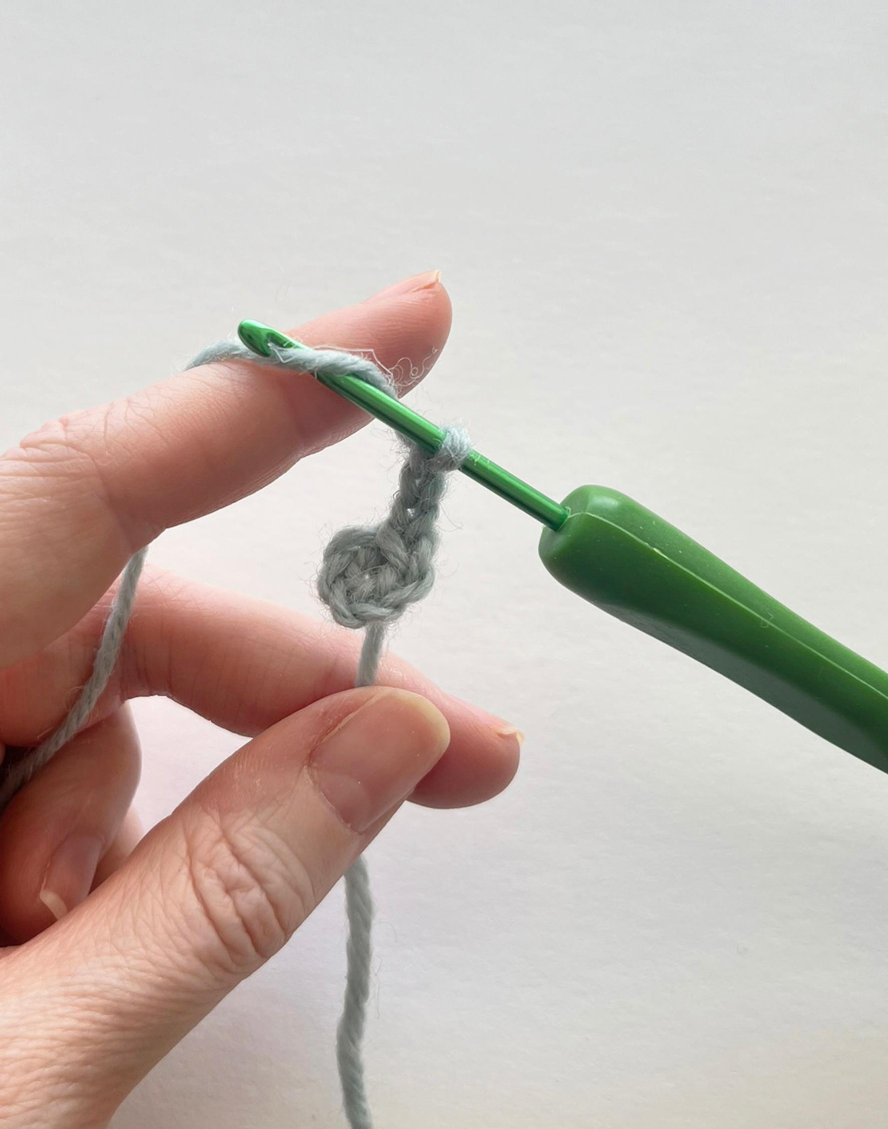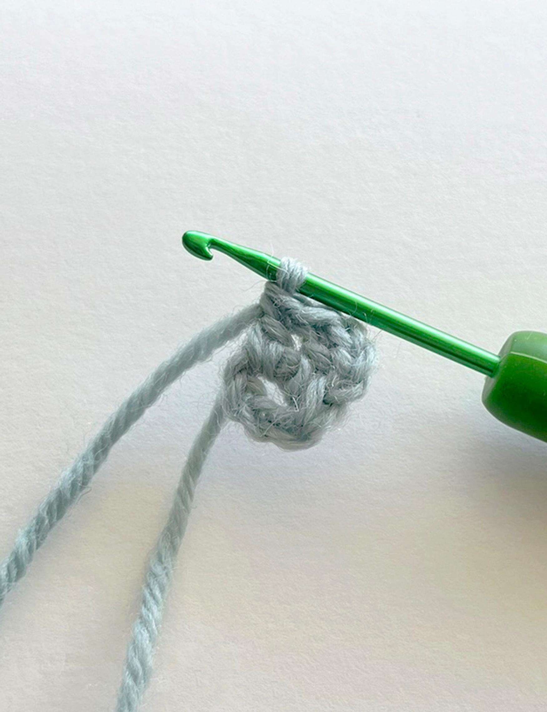 2. Virkkaa 1. pylväskerros: Tee ensin 3 ketjusilmukkaa, joka on kerroksen 1. pylväs. Virkkaa sitten renkaaseen 2 pylvästä. Kerroksen ensimmäinen pylväsryhmä on nyt valmis.
