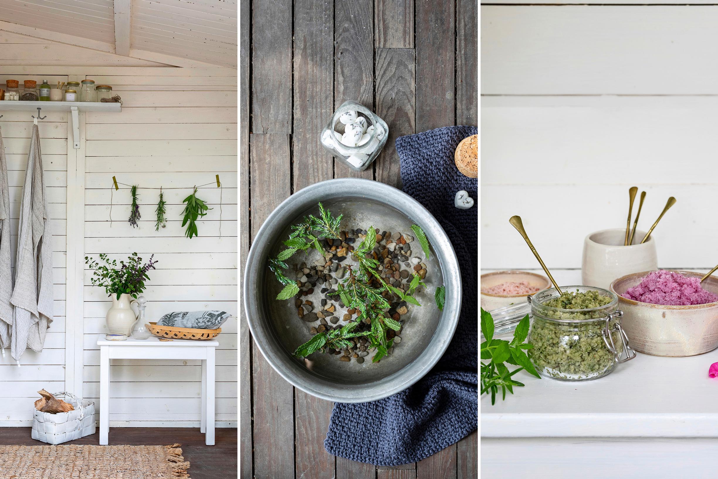 Kasvata ja kerää yrttejä sekä muita puutarhan antimia rentouttaviin kylpyhetkiin ja kauneudenhoitoon. Yrteistä tehdyt suola- ja sokerikuorinnat tekevät saunahetkestä ylellisen. Ne ovat myös mainio mökkituliainen!