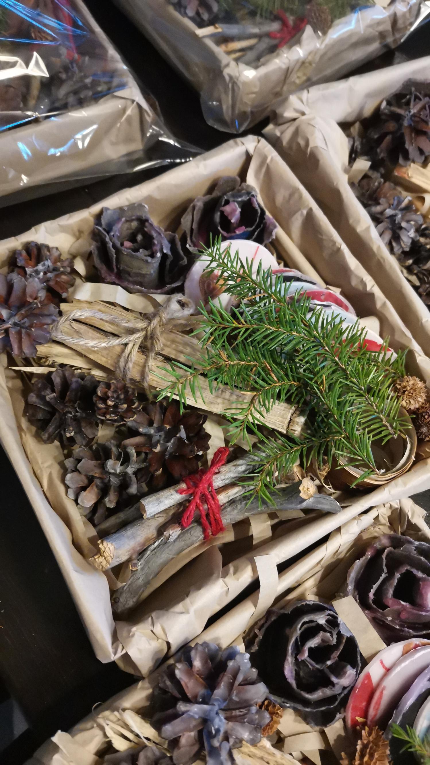 Sanna haluaa antaa lahjoja, jotka myös näyttävät kauniilta. Hän kokosi erilaiset sytykkeet kauniiksi asetelmiksi pahvilaatikoihin, joiden pohjalle hän silppusi ruskeaa paperia.