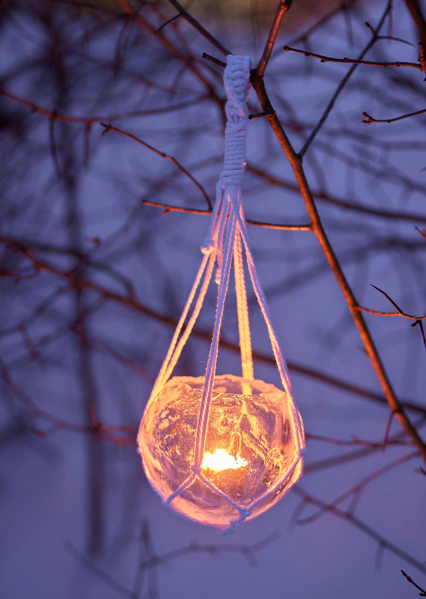 Helppo jäälyhty jäädytetään ilmapallossa ja ripustetaan amppeleissa pihapuun oksille tai parvekkeelle. Valo heijastuu kauniisti lyhdyn kirkkaasta pinnasta.
