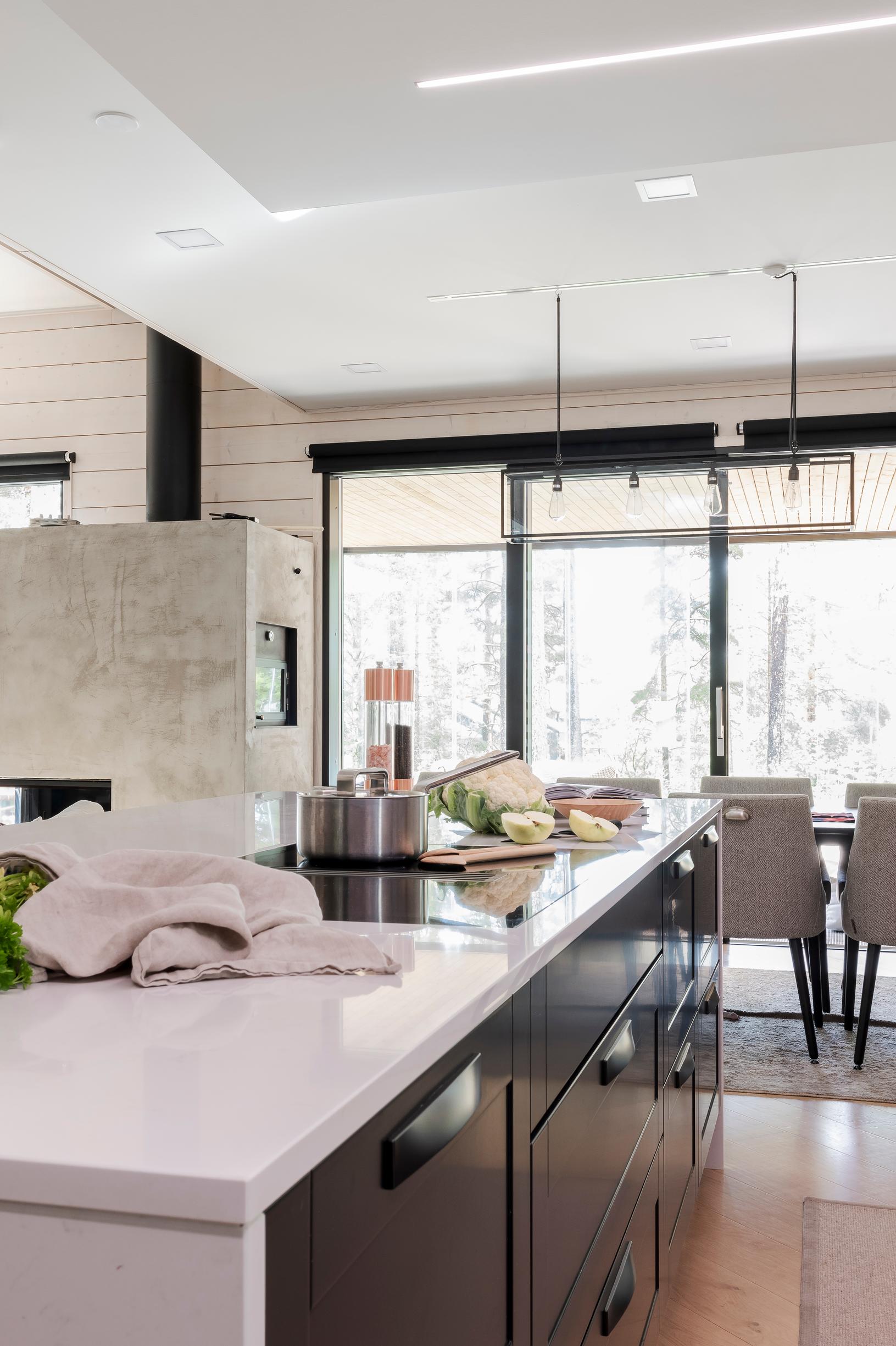 Ruoanlaitto on perheen yhteistä aikaa, joten keittiön täytyi olla iso ja toiminnoiltaan monipuolinen. Iso saareke mahdollistaa neljän ruuanlaittajan yhtäaikaisen työskentelyn. Talossa käy myös paljon sukulaisia ja ystäviä viettämässä aikaa, joten yksi suuri tila oli luonnollinen ja käytännöllinen ratkaisu.