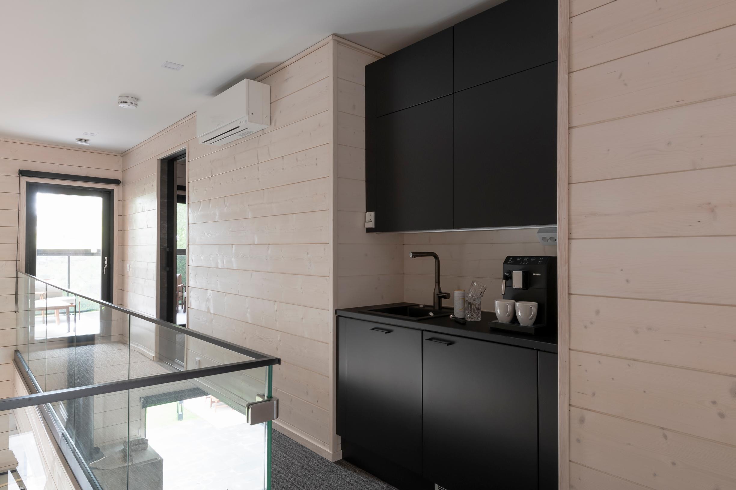 Yläkerrassa on erikseen sauna- ja suihkutilat sekä terassi. Ylhäällä on myös yhdistetty työ- ja vierashuone sekä isompi vapaa-ajan huone. Ohtamaat halusivat myös yläkertaan käytännöllisen pienen keittiön, jossa on vesipiste ja jääkaappi. Näin ei aina tarvitse erikseen lähteä alakertaan keittämään kahvia tai hakemaan vettä, jos tekee töitä työhuoneessa tai on vieraita vierashuoneessa.