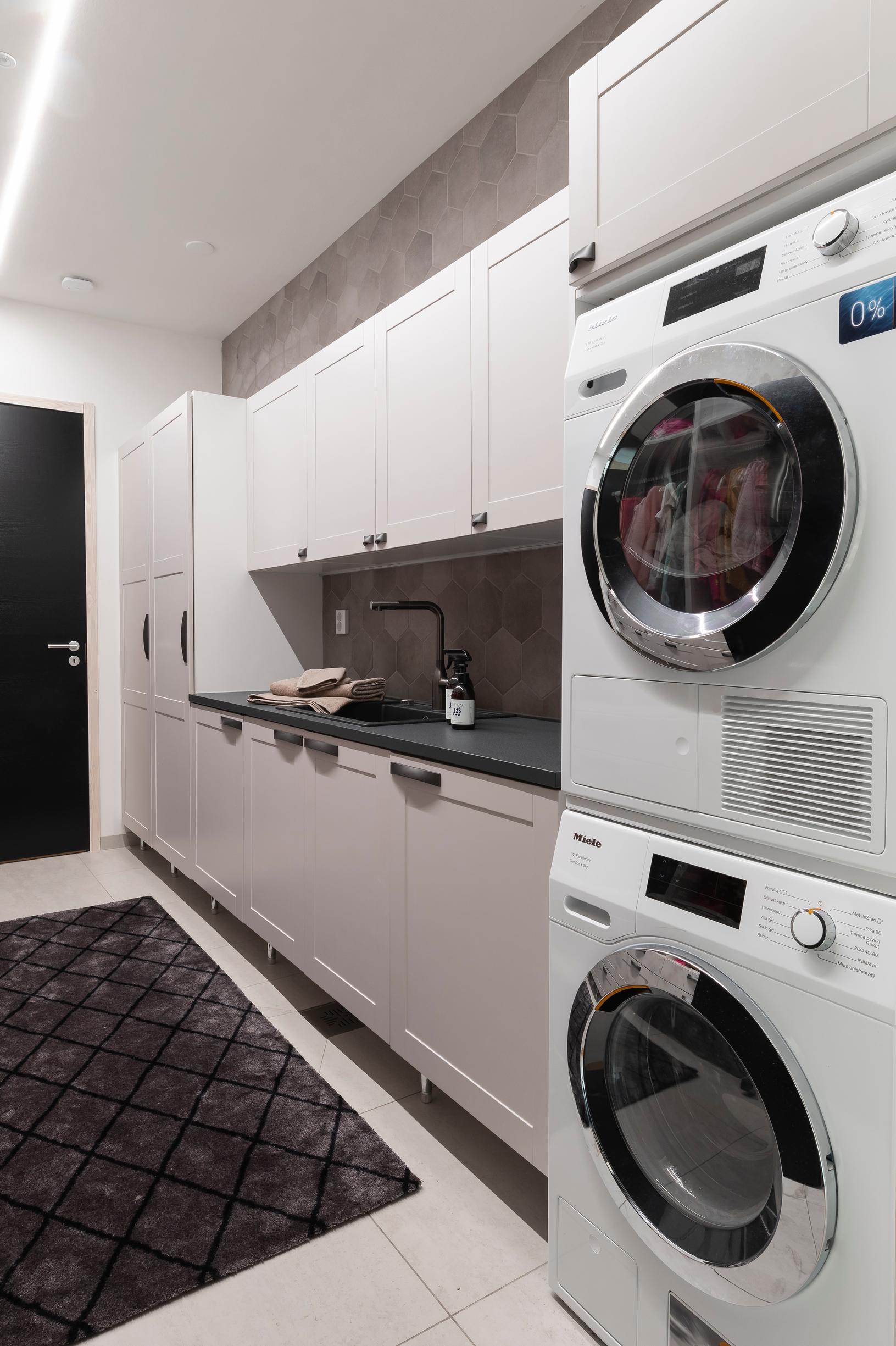 Pyykki- ja siivoushuoltoa on paljon ja siksi sille täytyi löytyä oma tila ja toiminnot. Perheen toive oli, että arjen pakolliset askareet sujuvat kätevästi ja tehokkaasti.
