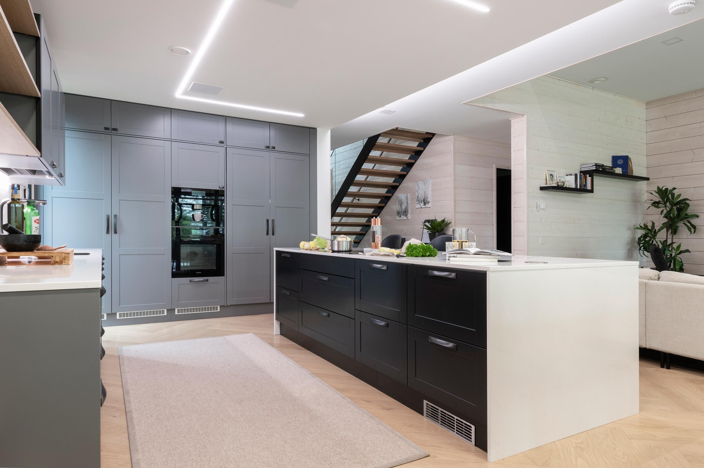 Keittiössä saareke ja korkeat kaapistot ovat eri väriset ja tämä ratkaisu on miellyttänyt perhettä kovasti. Kaapistot ovat Topi-Keittiöiden Rauhala-ovimallia väriltään taupen harmaa ja hiilenmusta.