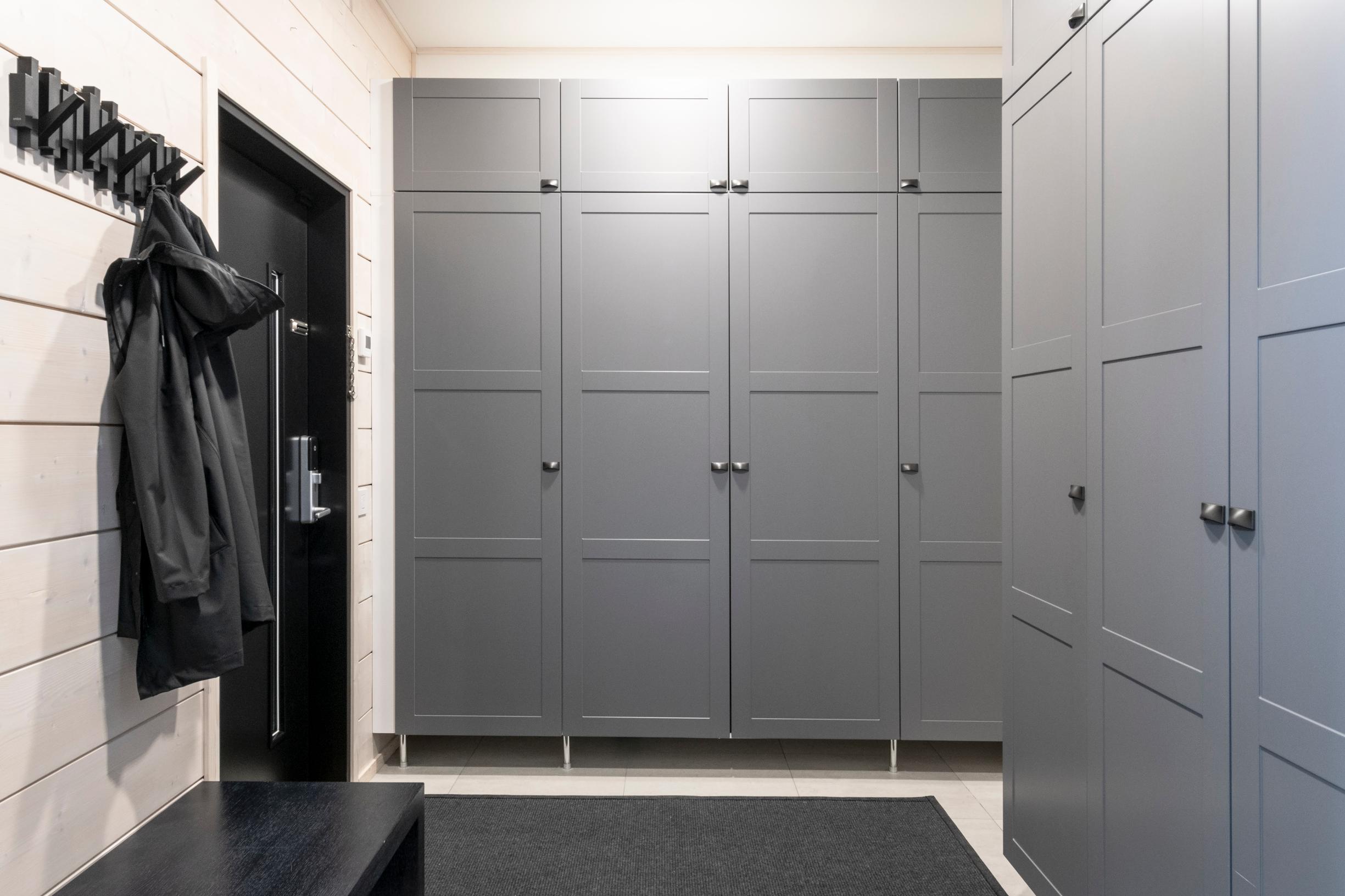 Nelihenkisessä perheessä ulkoiluvaatteita ja kausivaatteita löytyy paljon. Toiveena oli, että arkieteisessä nämä kaikki olisi helposti jokaisen löydettävissä ja pysyisivät siistissä järjestyksessä. Jokaiselle on oma hyllykaapisto sekä hengarisäilytys.