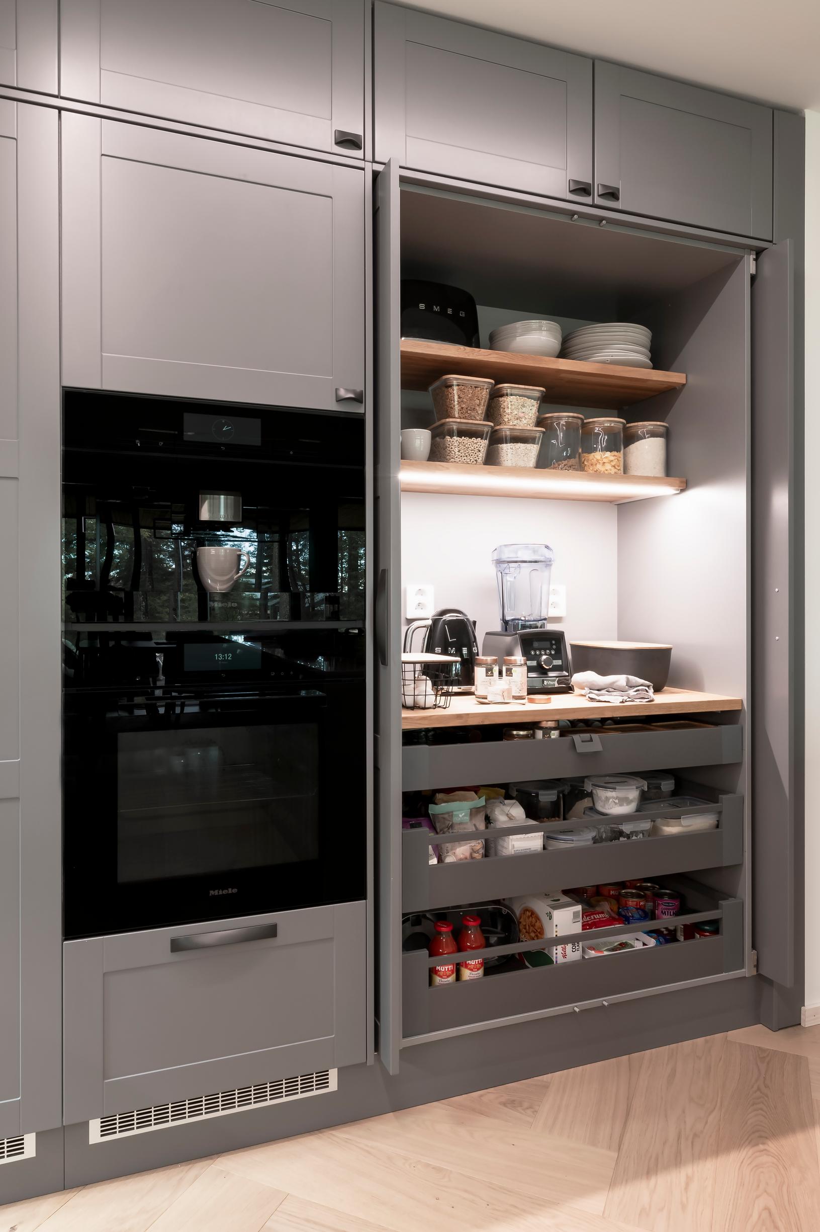 Aamiaiskaappi on keittiön salainen ase: sitä käytetään paljon muuhunkin kuin aamiaistarvikkeiden säilyttämiseen. Siellä säilytetään paljon kuivia ruoka-aineita sekä arkiastioita, monitoimikone, leivänpaahdin sekä keittiön käytetyin laite Vitamix-blenderi. Aamiaiskaapissa laitteet pysyvät piilossa mutta kuitenkin kätevästi käsillä.