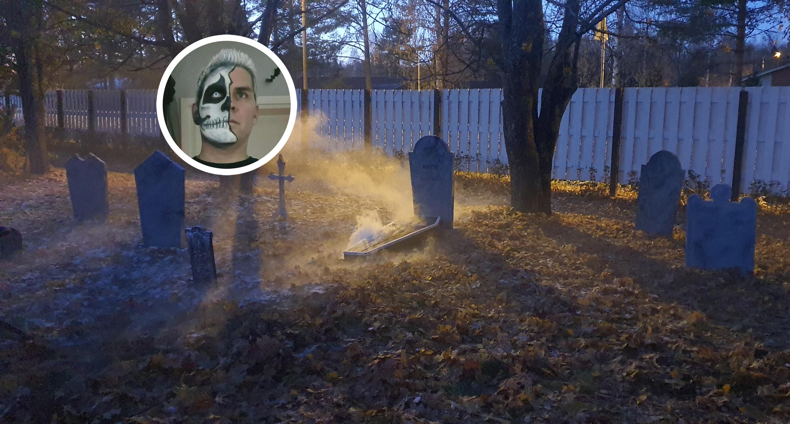 Jani Ruokamo, 44, innostui halloween-koristeluista niin, että luurankoja ja hautakiviä varten täytyy pian rakentaa uusi varastorakennus. Kierrätysmateriaalit peittyvät vuoroin maaliin ja sementtiin.
