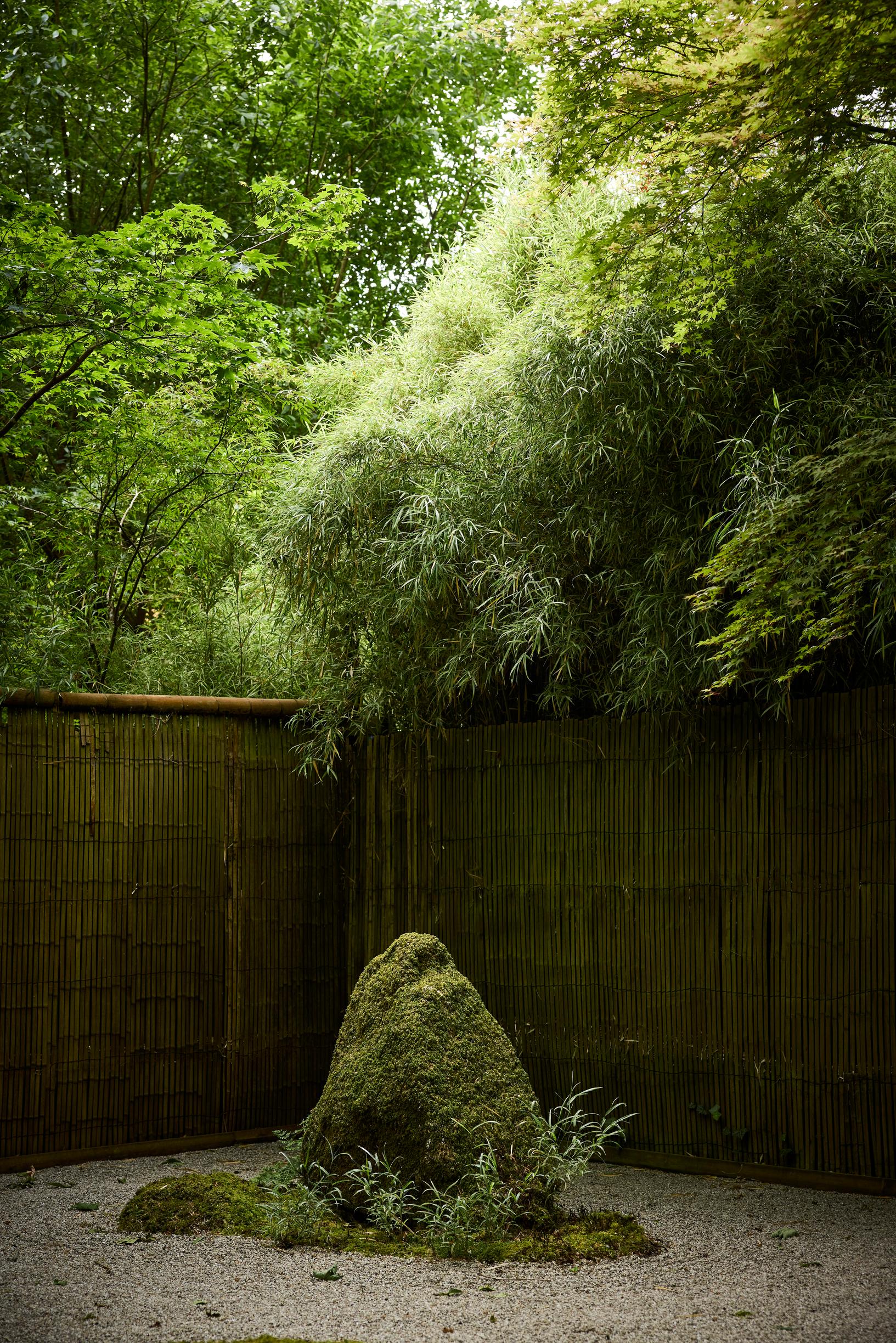 Karu Zen-puutarha sijaitsee hieman syrjässä. Haravoidun ja aidatun hiekkapihan keskellä on tarkasti asetettuja kivilohkareita, ja pelkistetty miljöö antaa tilaa mietiskelylle. Zen-puutarhasta matka jatkuu vehreänä loistavan sammalpuutarhan kautta teehuoneelle ja sieltä vaahterametsän läpi suurelle lammelle, jonka laidalla kukkivat hennon violetit kurjenmiekat ja ylle kaartuvat japaninvaahterat ja pilven muotoisiksi leikatut männynoksat. Lammessa viihtyvät yhtä lailla haikarat ja koikarpit, alkukesästä sitä myötäilevät polut täyttyvät pienistä sammakoista.