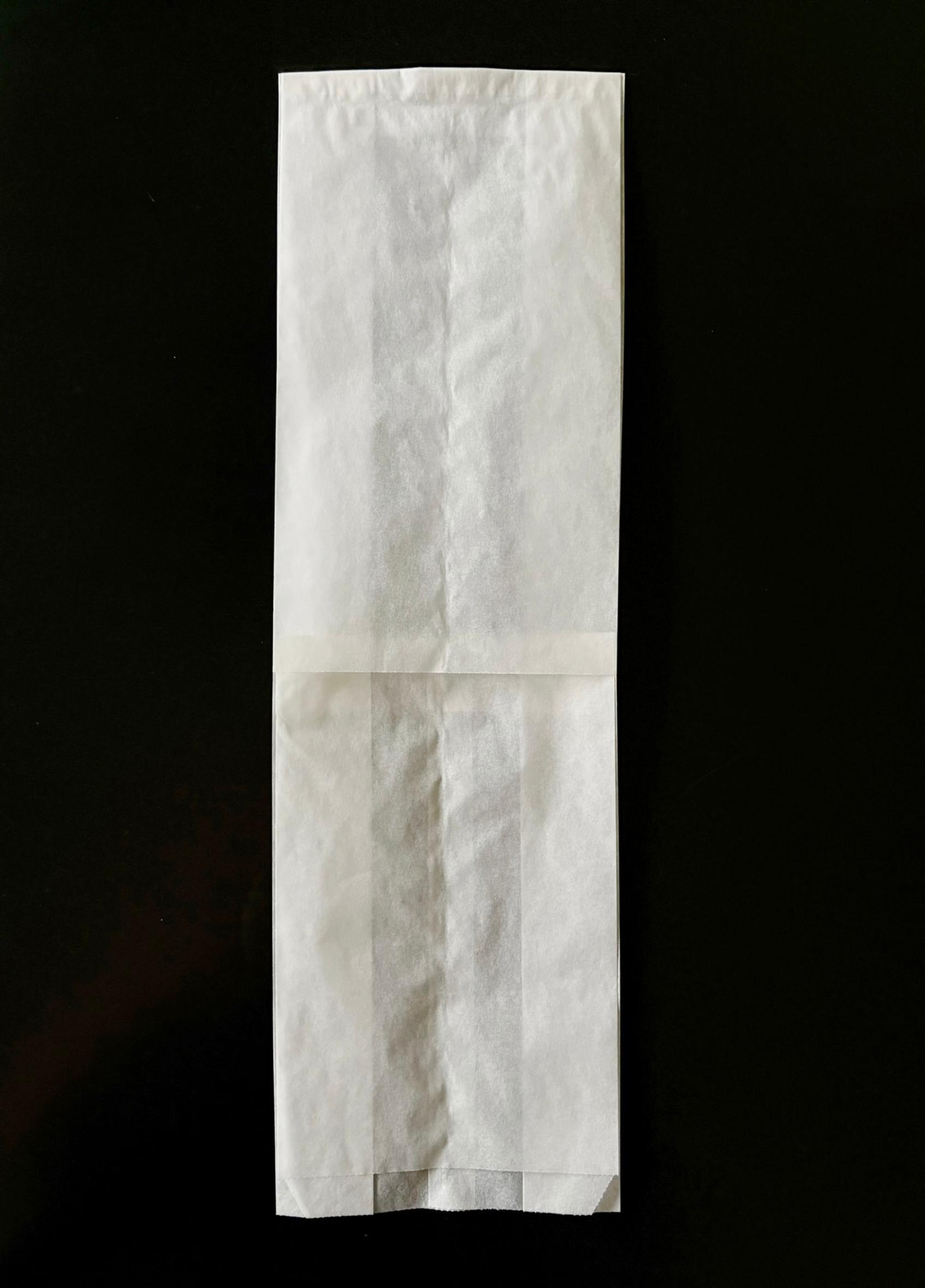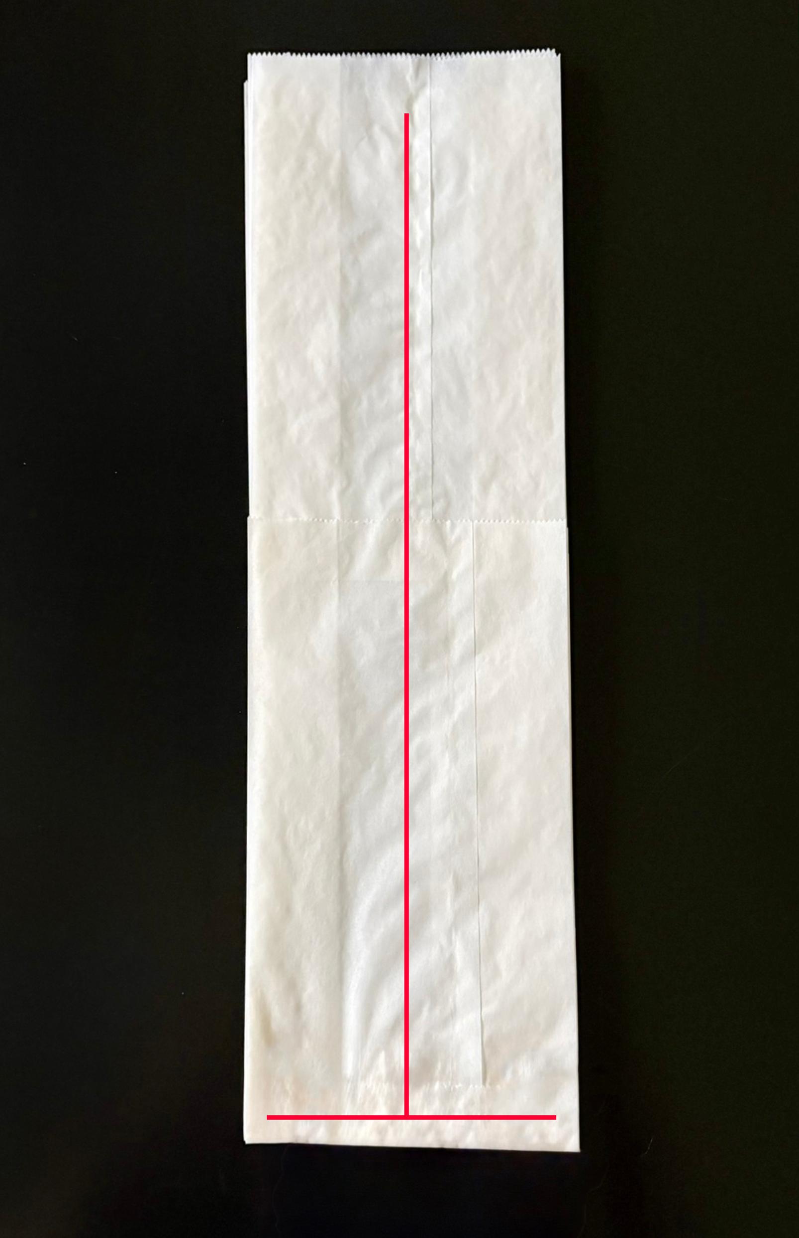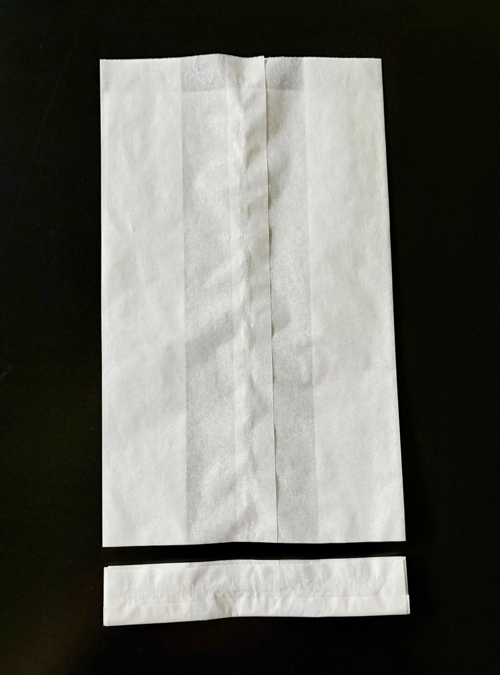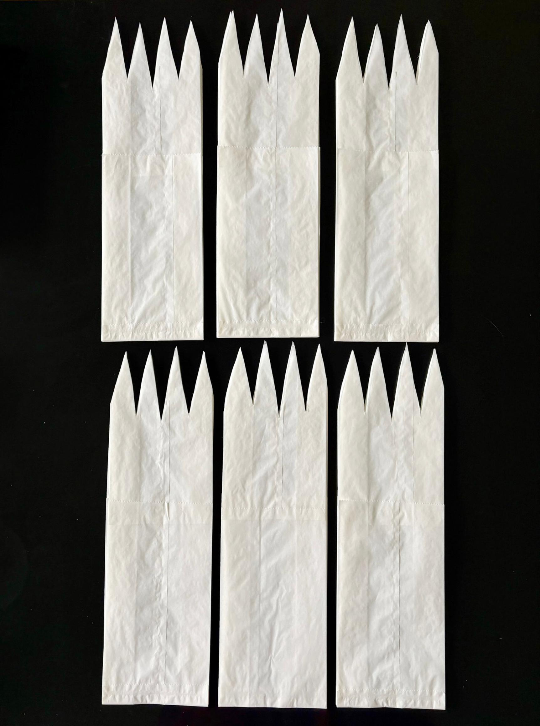 3. Liimaa viisi pussiparia päällekkäin. Levitä liimaa pussien keskelle ja alareunaan ylösalaisin olevan T-kirjaimen mallisesti. Muista katsoa, että liimaat jokaisen pussiparin samoin päin. Liimaa ei tarvitse levittää pussin suuaukkoon asti, sillä päät leikataan lopuksi pois. Tee yhteensä kuusi nippua, joihin jokaiseen tulee viisi pussiparia.