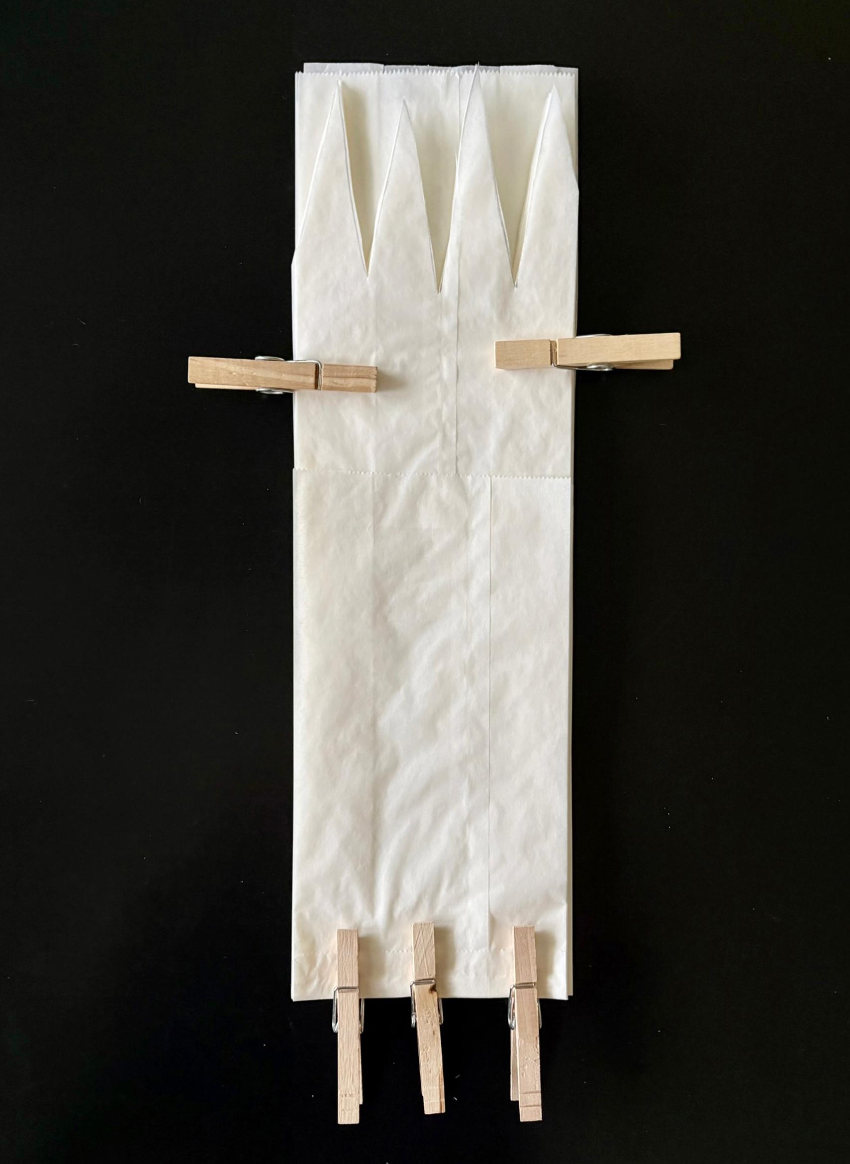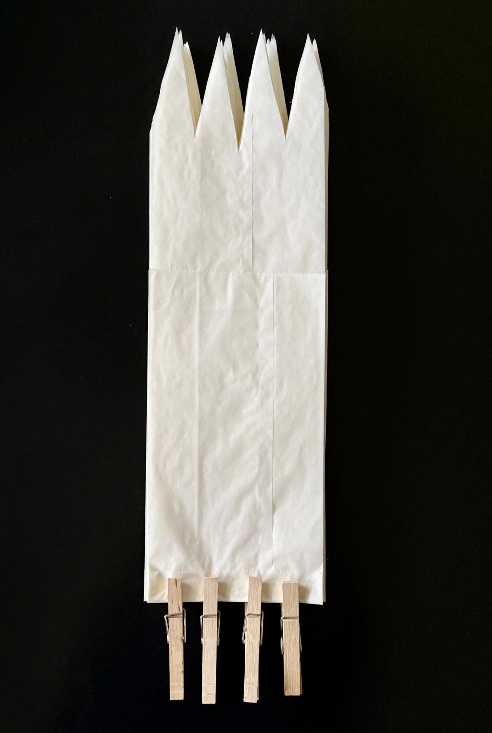 5. Kiinnitä leikattu pussinippu toisen nipun päälle pyykkipojilla. Leikkaa sama kuvio seuraavaan nippuun ensimmäistä mallina käyttäen.