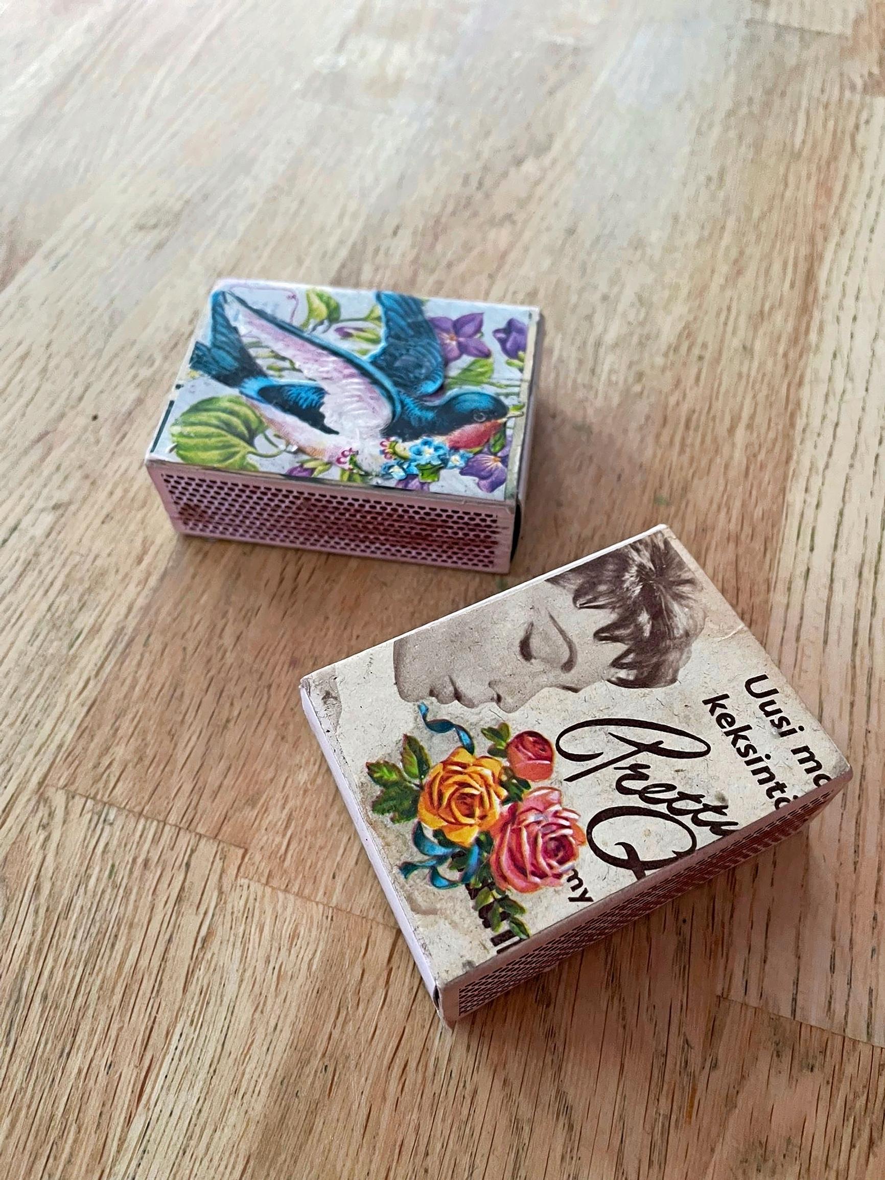 Ideat syntyvät usein spontaanisti. Kun sytyttelin kynttilöitä, tulitikkurasia näytti mielestäni vähän rumalta ja päätin, että se pitää päällystää. Askin voi kääriä kauniin kynttilän kanssa sellofaaniin ja antaa lahjaksi.