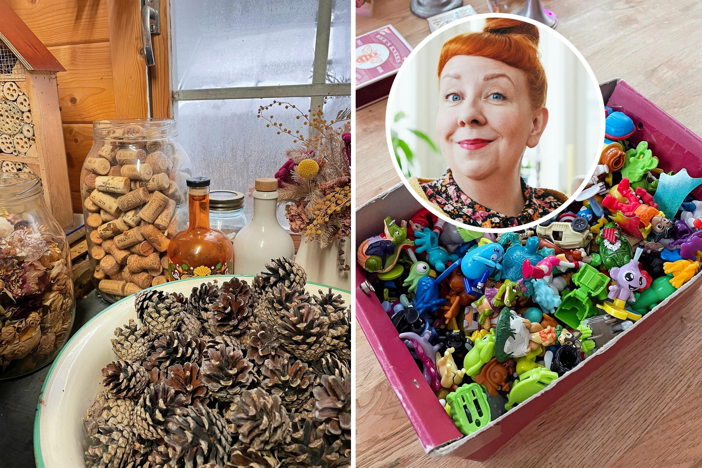 Näyttelijä-kirjailija Jenni Kokanderin kotoa löytyy lähes mitä tahansa tarviketta siististi järjestettyinä. Toisinaan keräilyt päätyvät askartelutarvikkeiksi, lahjoiksi tai näytelmän puvustukseen. Katso Jennin riemukkaat kuvat keräilyaarteista!