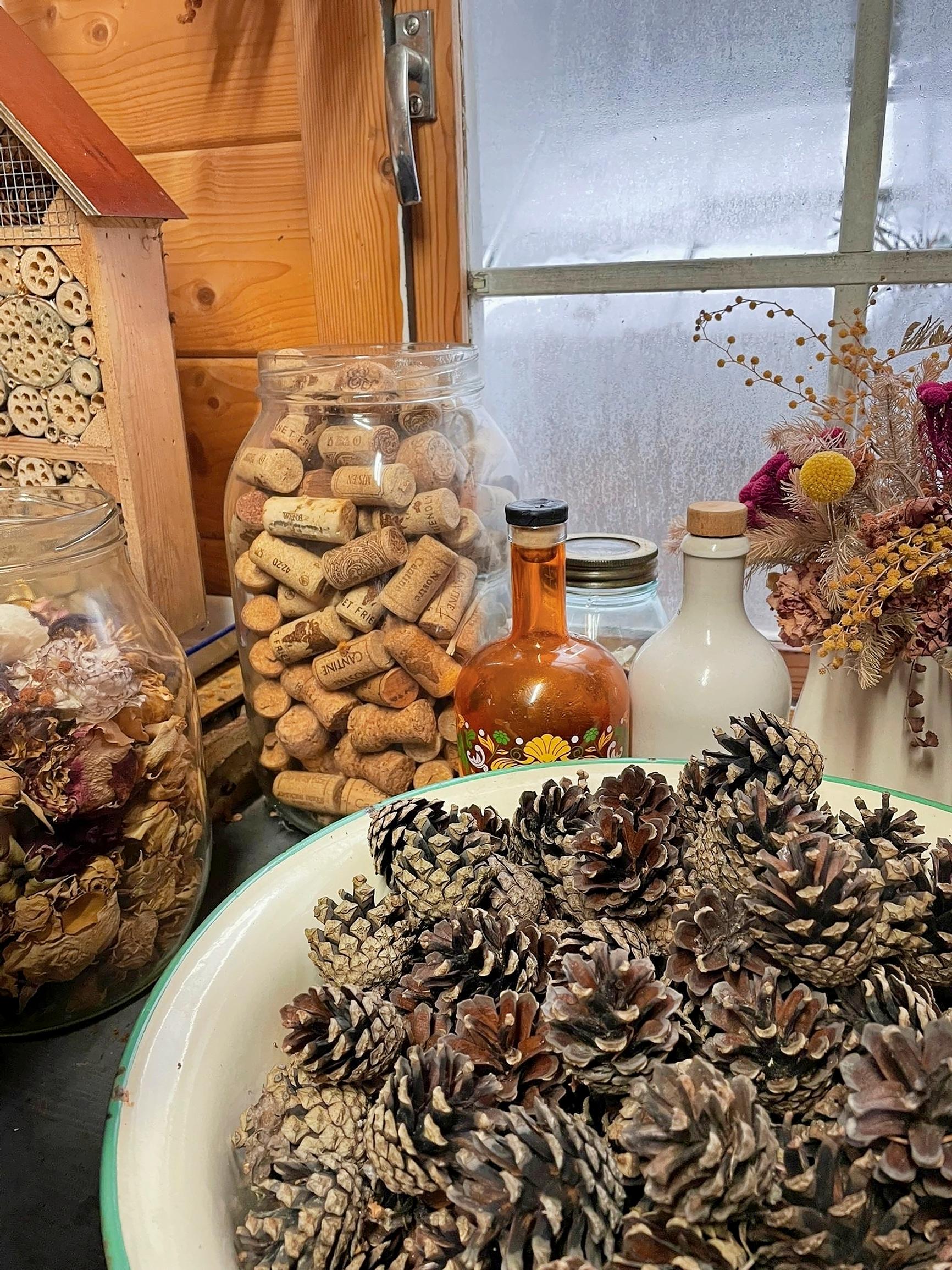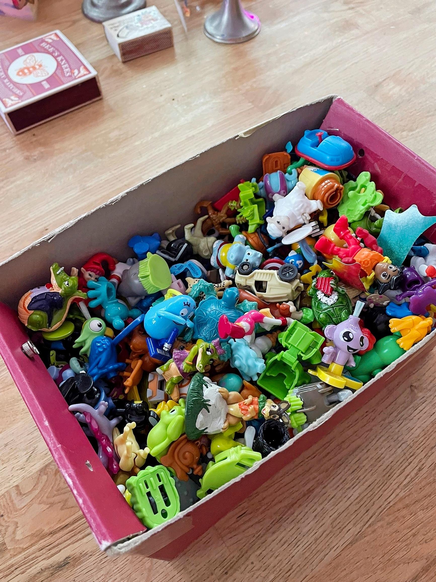 Olen säästänyt muun muassa lasten saamia Kinder-munien yllätyksiä, joita on iso laatikollinen. Lapsemme ovat nyt 13- ja 18-vuotiaita, joten yllätyksiä on paljon, satoja. Säästän myös kaikki postikortit, lahjapakettien paperit ja narut. Puran virpomisvitsoista sulat ja silkkipaperit ja säästän ne. Laitan säilöön myös viinipullon korkit, jäätelötikut, kuminauhat ja kauniit kävyt.