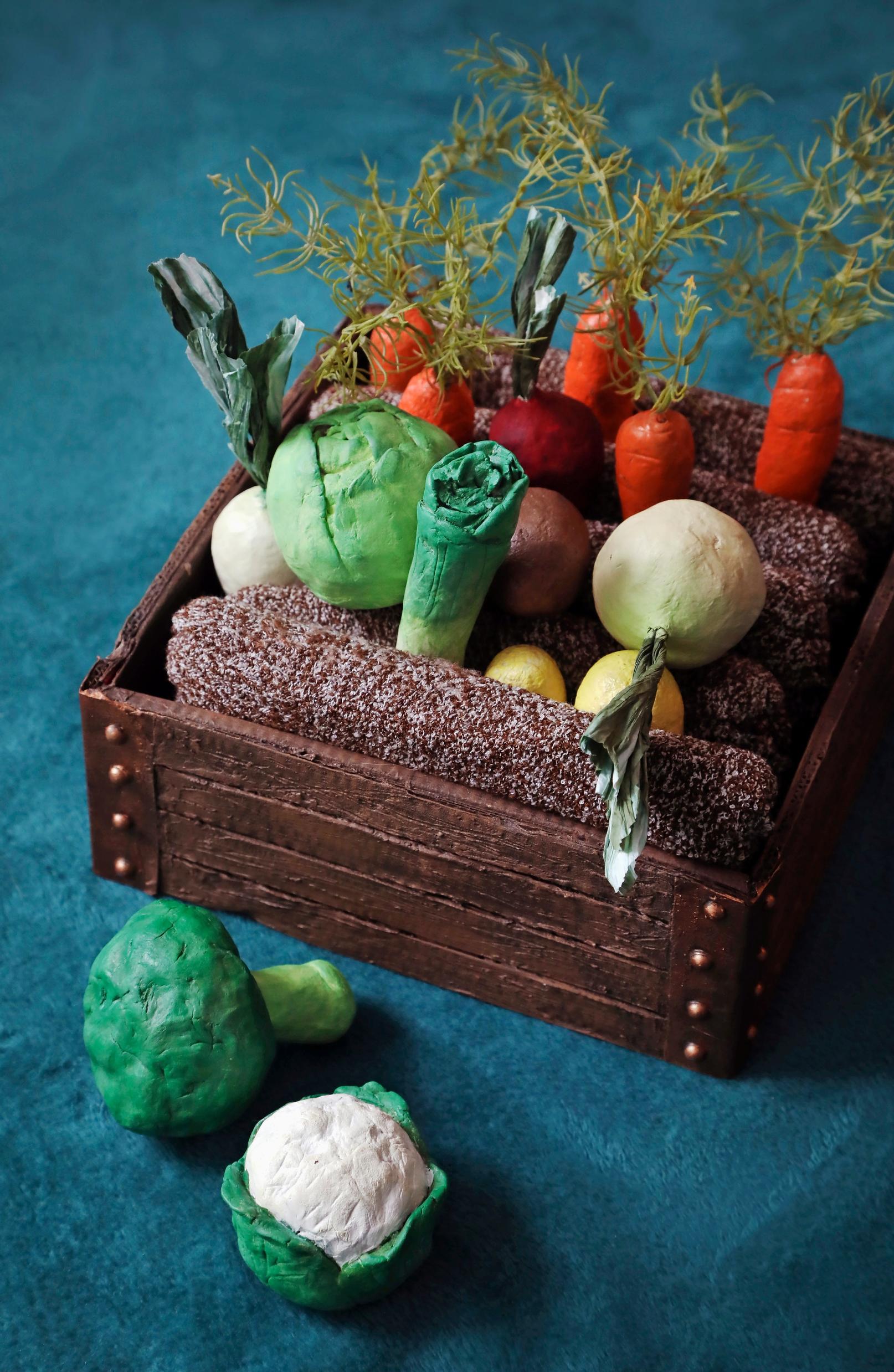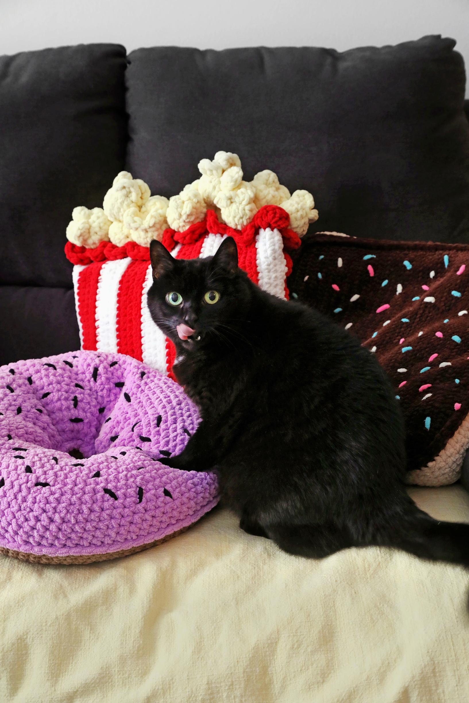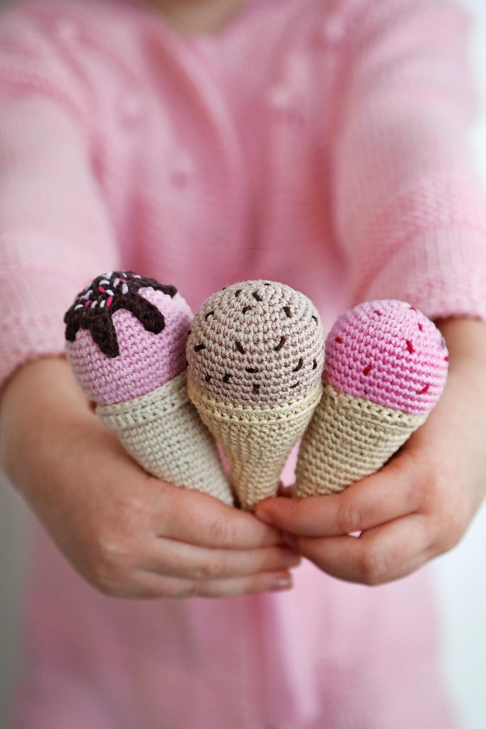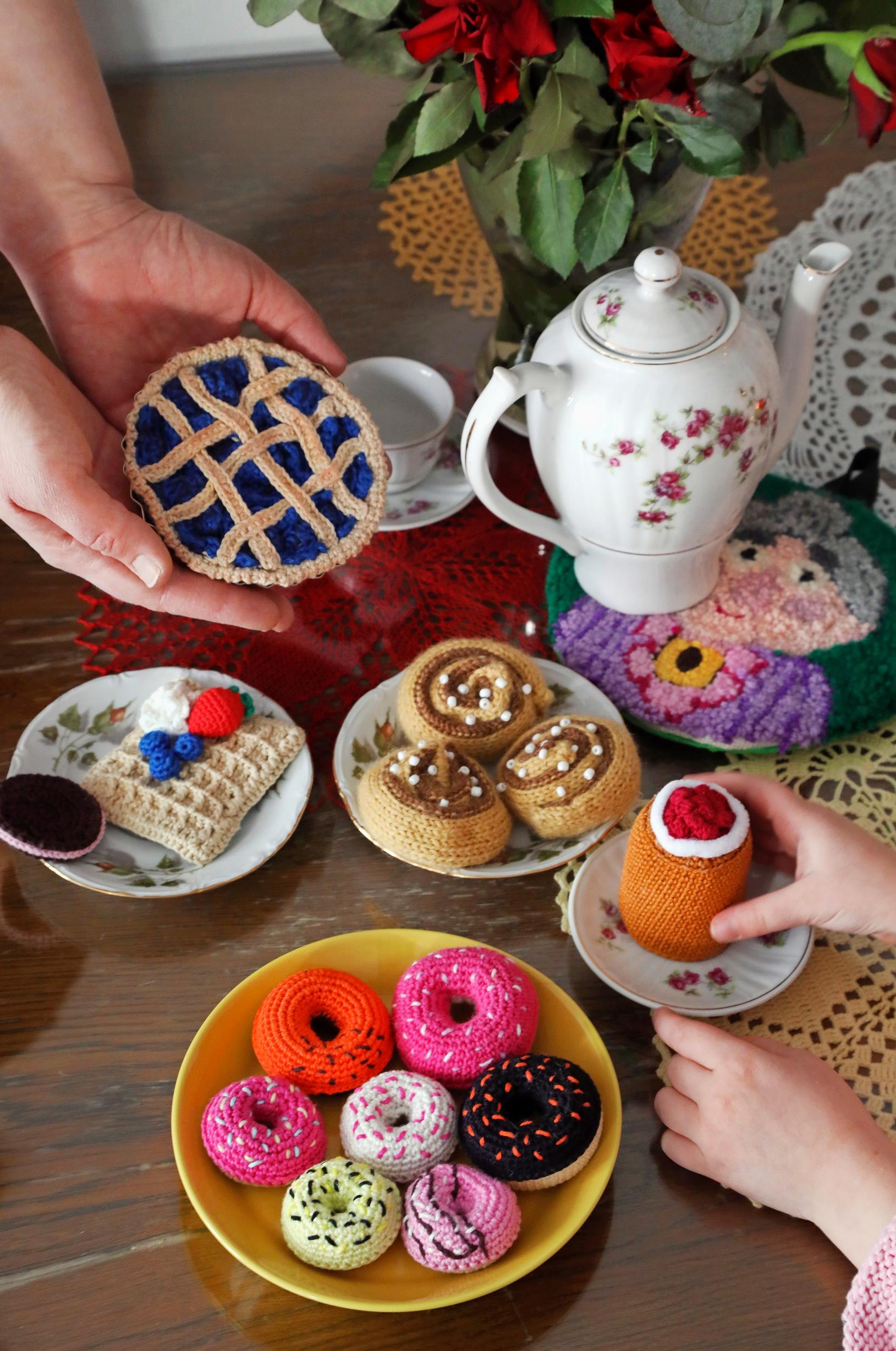 Lapseni toiveet ovat ykkössijalla. Kasvisten lisäksi olen tehnyt hänelle muun muassa donitseja, kakkuja, sushia, leipiä, pizzapaloja, korvapuusteja ja erilaisia grillattavia ruokia. Mietimme yhdessä, mitä kaikkea ruokakaupassa tai leipomossa pitäisi olla tarjolla. Virkattujen leikkiruokien lisäksi teen muitakin leluja, erityisesti satuhahmoja.