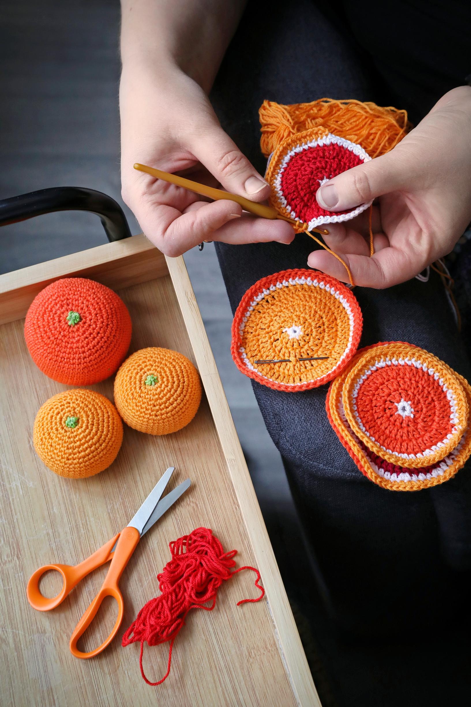 Olen nauttinut käsitöistä niin kauan kuin muistan. Tarve käsillä tekemiseen tulee suvusta – äitini ja molemmat mummuni ovat aina tehneet paljon asioita itse. Viitisen vuotta sitten tyttäreni syntymän myötä löysin uudelleen virkkauksen, kun aloimme lapseni kanssa tutustua väreihin, muotoihin ja makuihin. Valitsimme tytön kanssa yhdessä sellaisia hedelmiä ja vihanneksia, joita löytyy helposti ruokakaupoista. Haimme kaupasta aina yhdessä päivän hedelmän, jota aloimme tutkia. Piirsimme sen paperille, maistoimme sitä ja seuraavana päivänä hän sai leikkeihin virkkaamani hedelmän. Tyttäreni syö monipuolisesti lähes kaikkea ja uskon, että tämä ruokakasvatus on ollut myös siinä hyödyllistä.