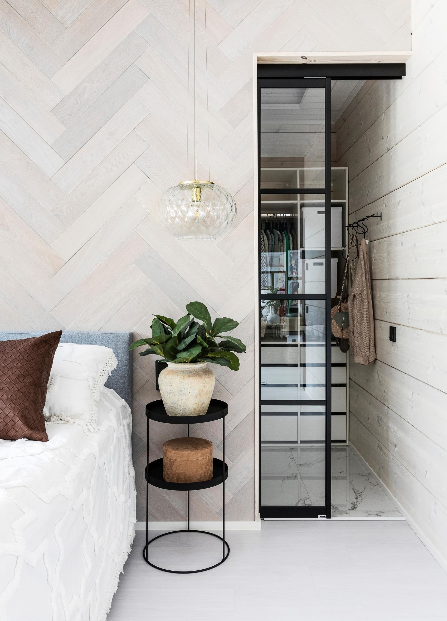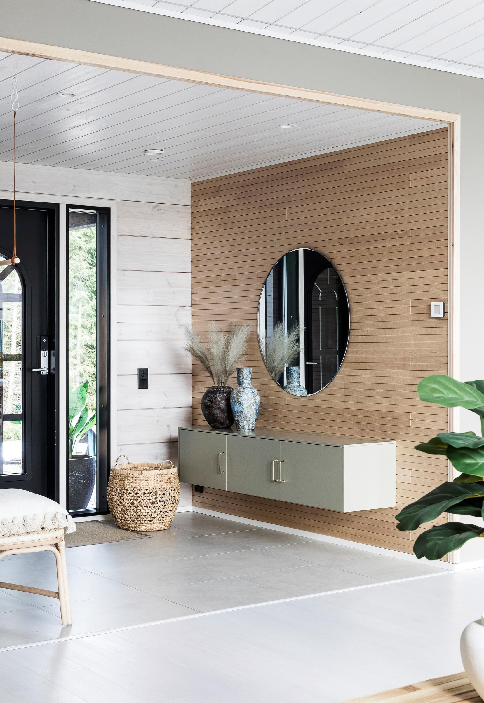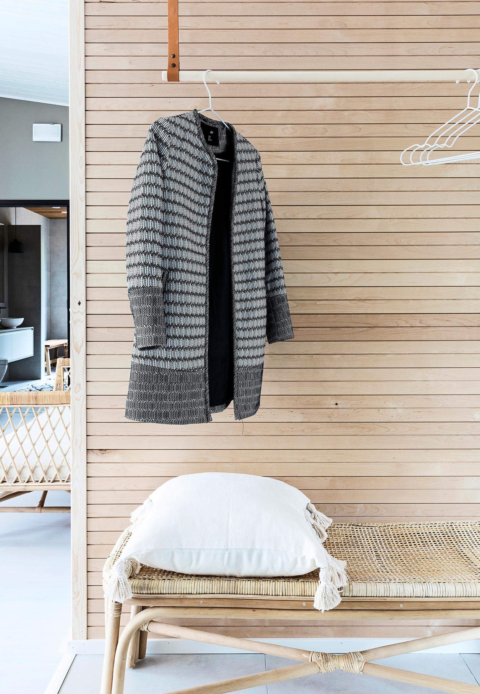 Selkeys alkaa heti eteisestä. Koivupaneelilla päällystetyllä seinällä roikkuu puinen vaatetanko vieraiden vaatteille, ja edessä seisoo rottinkinen penkki istahtamista varten. Sitä vastapäätä on vähäeleinen taso ja suuri pyöreä peili. Lojuvia kenkiä, isäntäväen vaatteita tai edes raskaita vaatekaappeja ei näy missään.