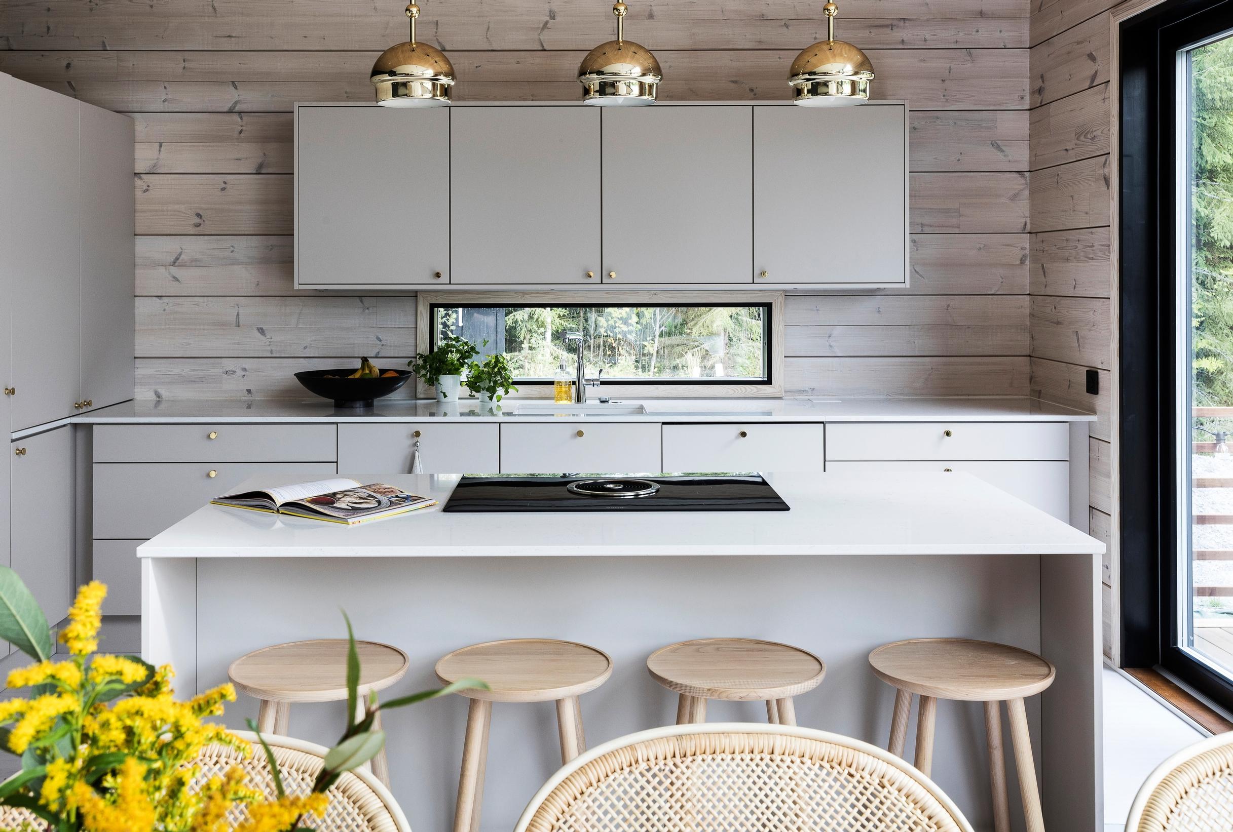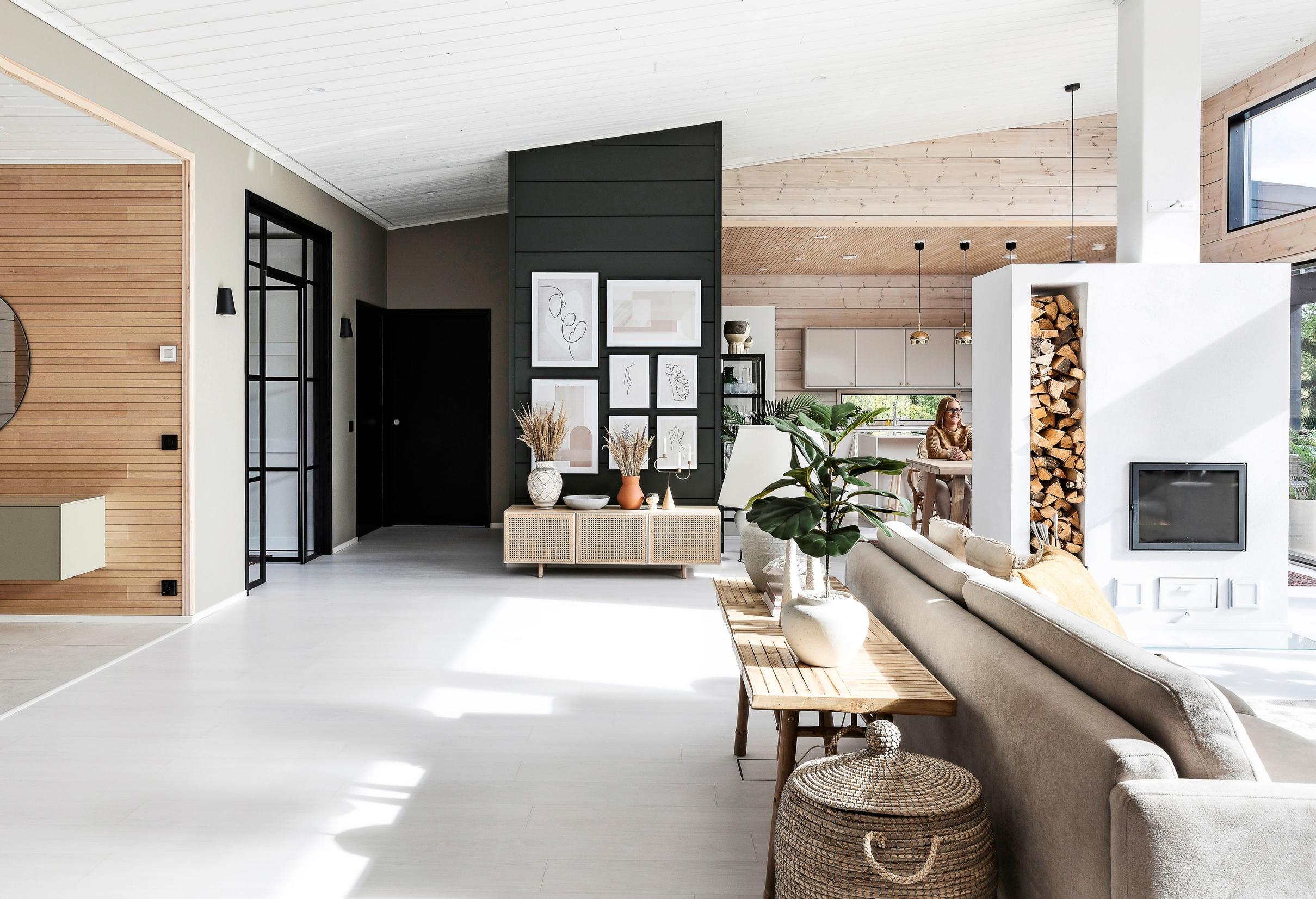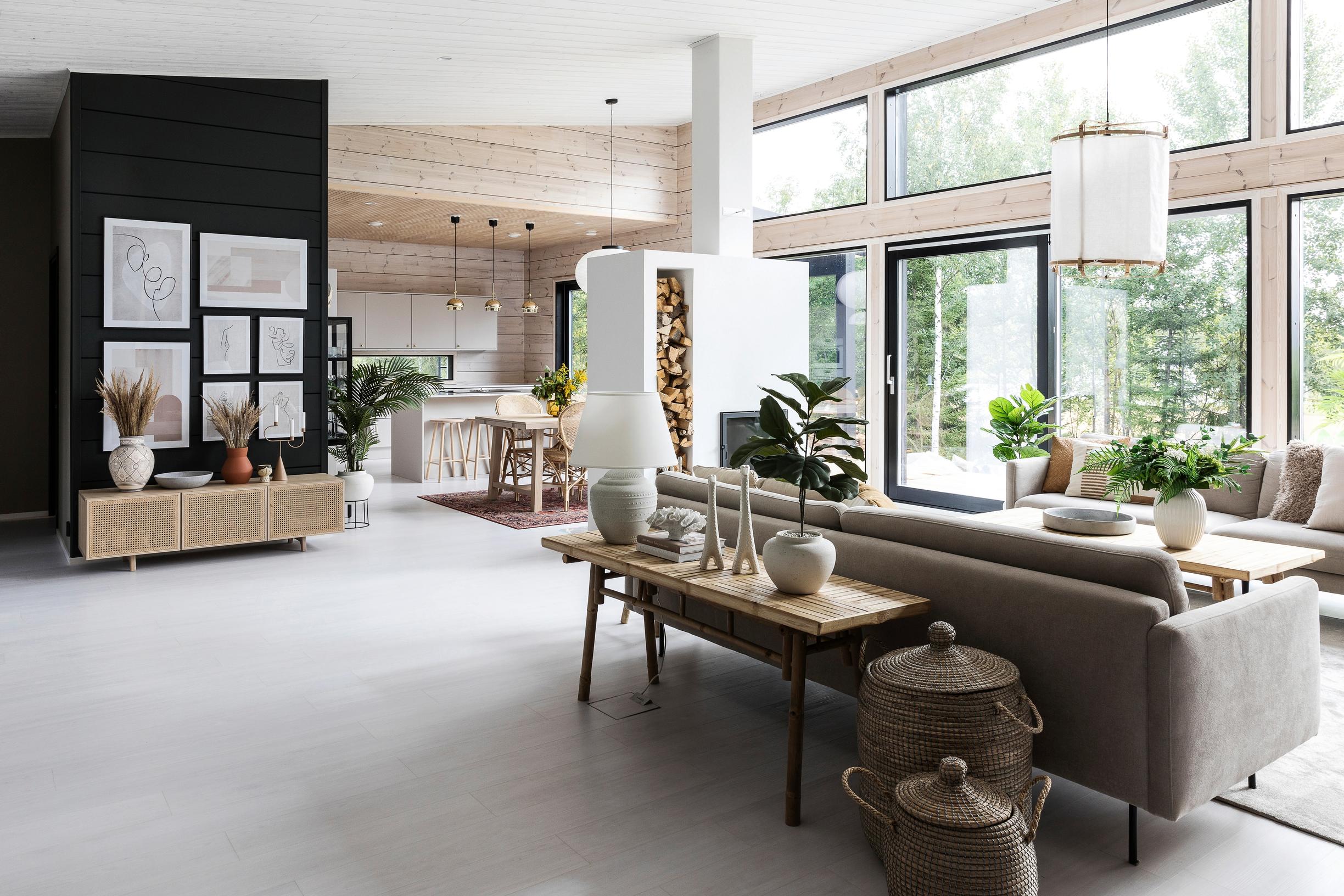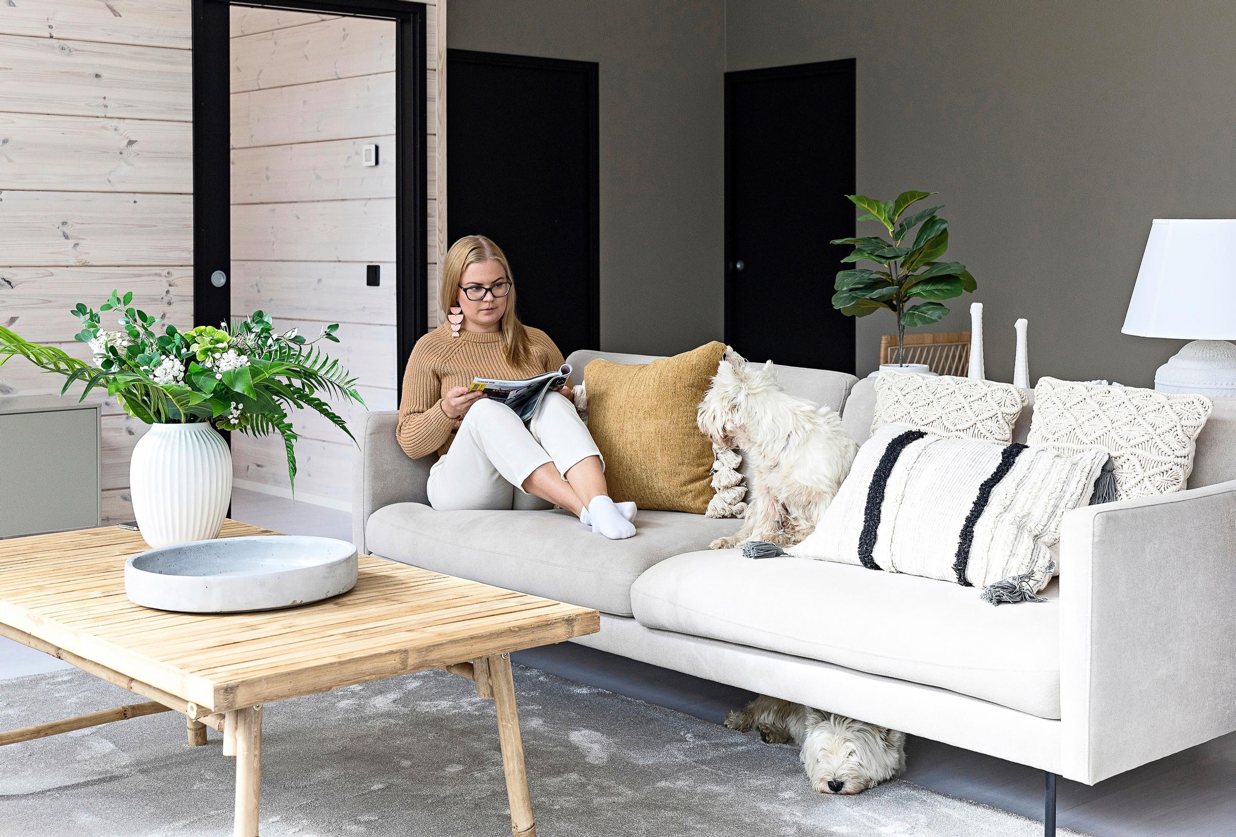 – Tiesin, että haluan kaksi sohvaa vastakkain. Hahmottelin, minkä kokoisia ne voisivat olla. Keittiöön suunnittelin kuuden hengen ruokapöydän ja valaisimen sen päälle. Kokonaisuudesta tulee viimeistelty, kun kalustus on mietitty jo ennen kuin taloa on rakennettu, hän toteaa.