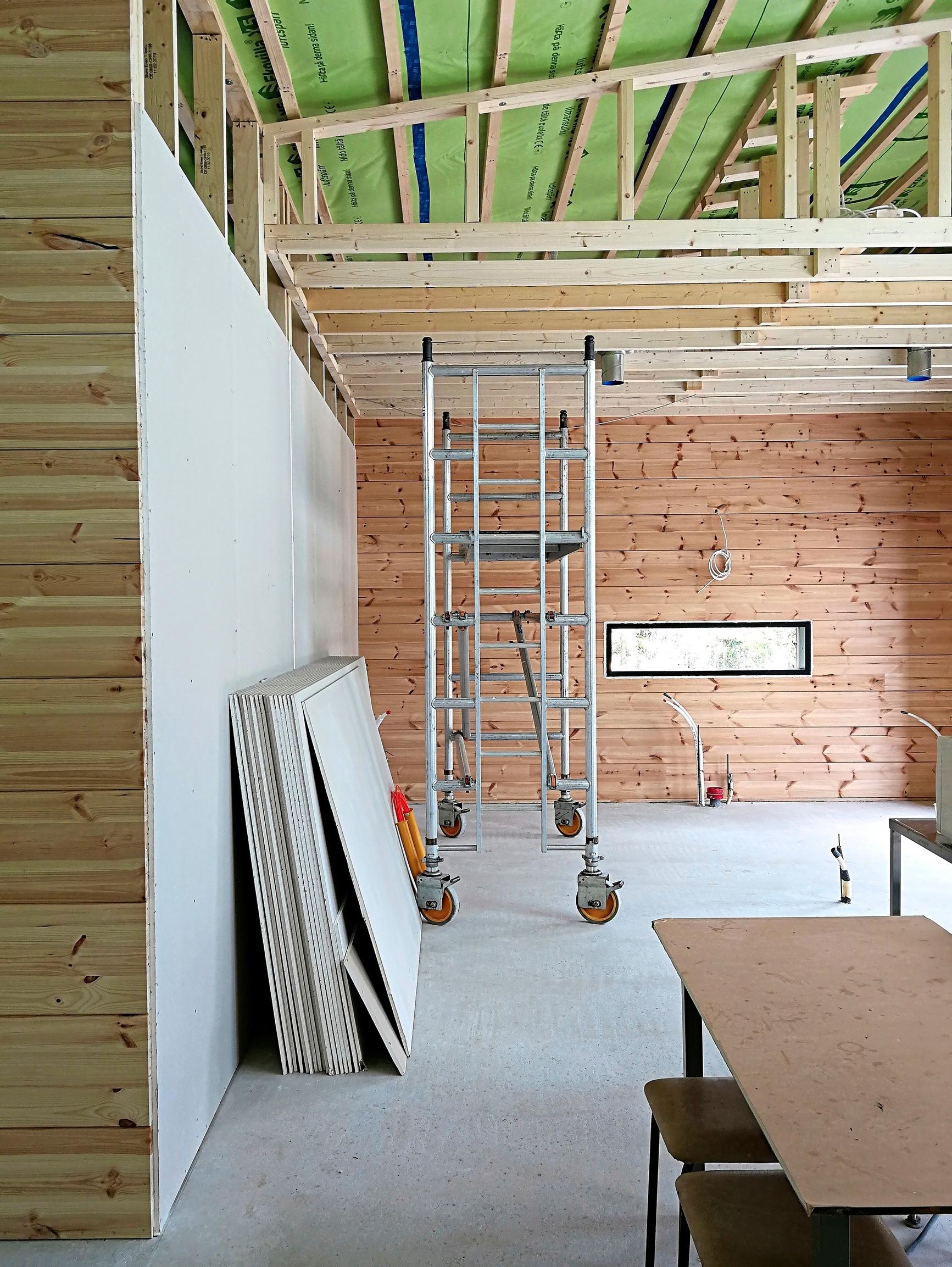 – Rakentaminen sujui yllättävän hyvin, kun suunnittelimme ja selvitimme kaiken aina hyvissä ajoin etukäteen. Yksi hankalimmista työvaiheista oli tuulensuojalevyn asentaminen kattotuolien väliin. Myös lattiavalun hidasta kuivumista stressasimme, mutta kyllä se lämmittimien avulla lopulta kuivui, Jenni kertoo.