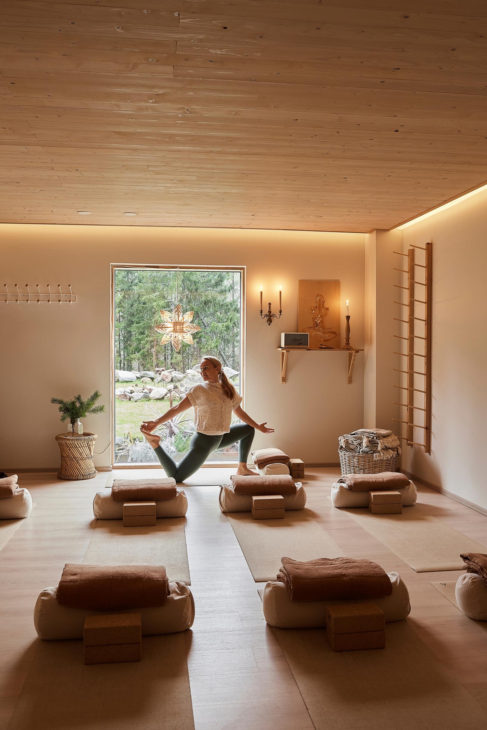 Joogasalin harmoninen tunnelma syntyy ison ikkunan luomasta luonnonvalosta, epäsuorasta valaistuksesta, puupinnoista ja niitä myötäilevistä pehmeistä sävyistä.