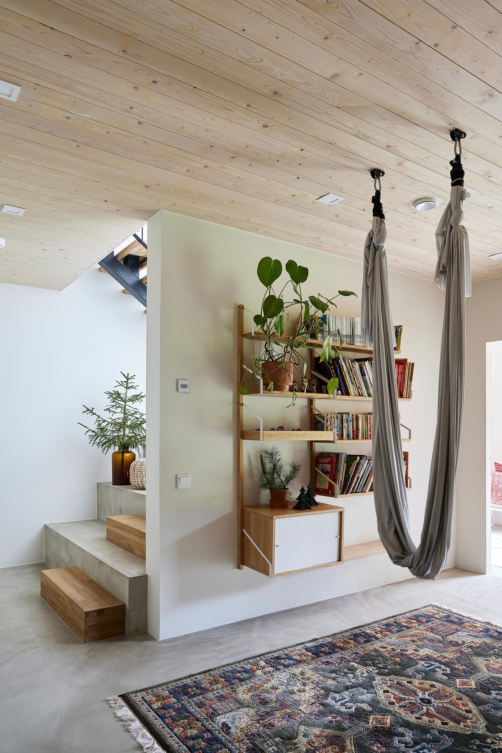 Joel: Harrastan autoja ja halusin autotallin. Koska rinnetontilla sisääntulo on yläpihalla, autotallin alapuolelle jäi luonnollisesti tila, jonka suunnittelimme alun perin varastoksi. Rakentamisaikana Aurora kävi joogaopettajan koulutusta ja keksi sen jälkeen, että varastosta tulisi kaunis joogatila.