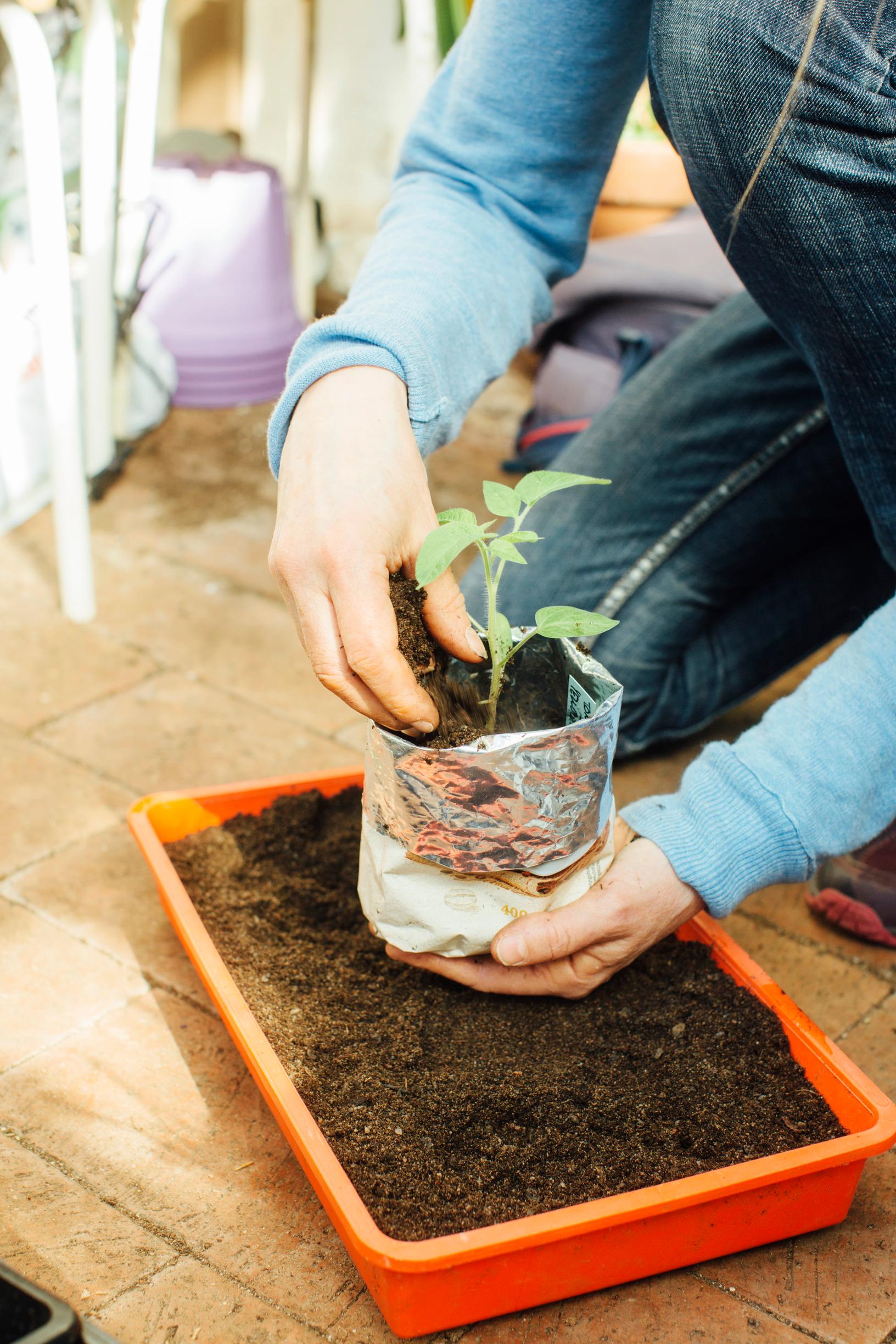 Tomaatin koulinnan ja ruukutuksen vältät kylvämällä sen alas rullattuun kahvipussiin. Kun taimi kasvaa, rullaa pussia ylöspäin ja lisää samalla multaa. Kylvä tomaatin siemenet 8–10 viikkoa ennen toivomaasi istutusaikaa.