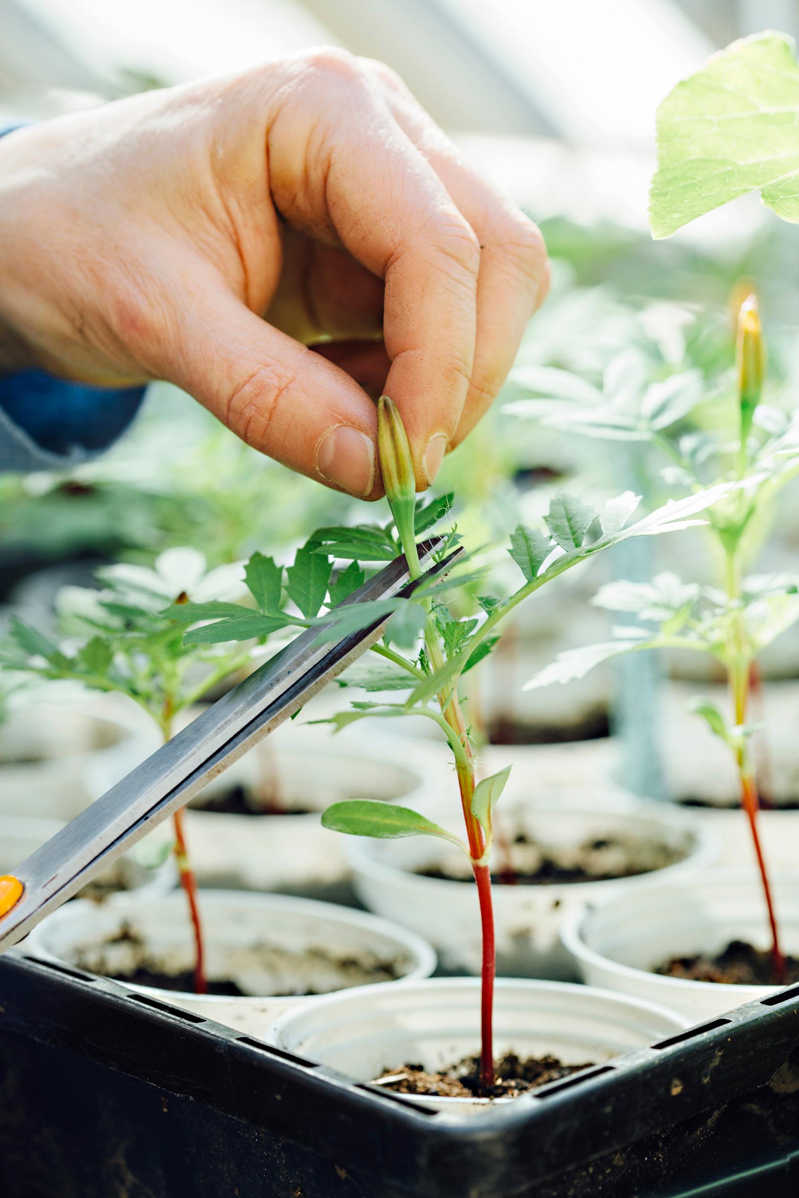 Samettikukka kasvattaa taimen latvaan nupun usein jo kymmensenttisenä. Napsi nuput pois, jotta taimi vahvistuu. Myös pienen, kukkimaan innostuneen chilin ensimmäiset nuput kannattaa poistaa.