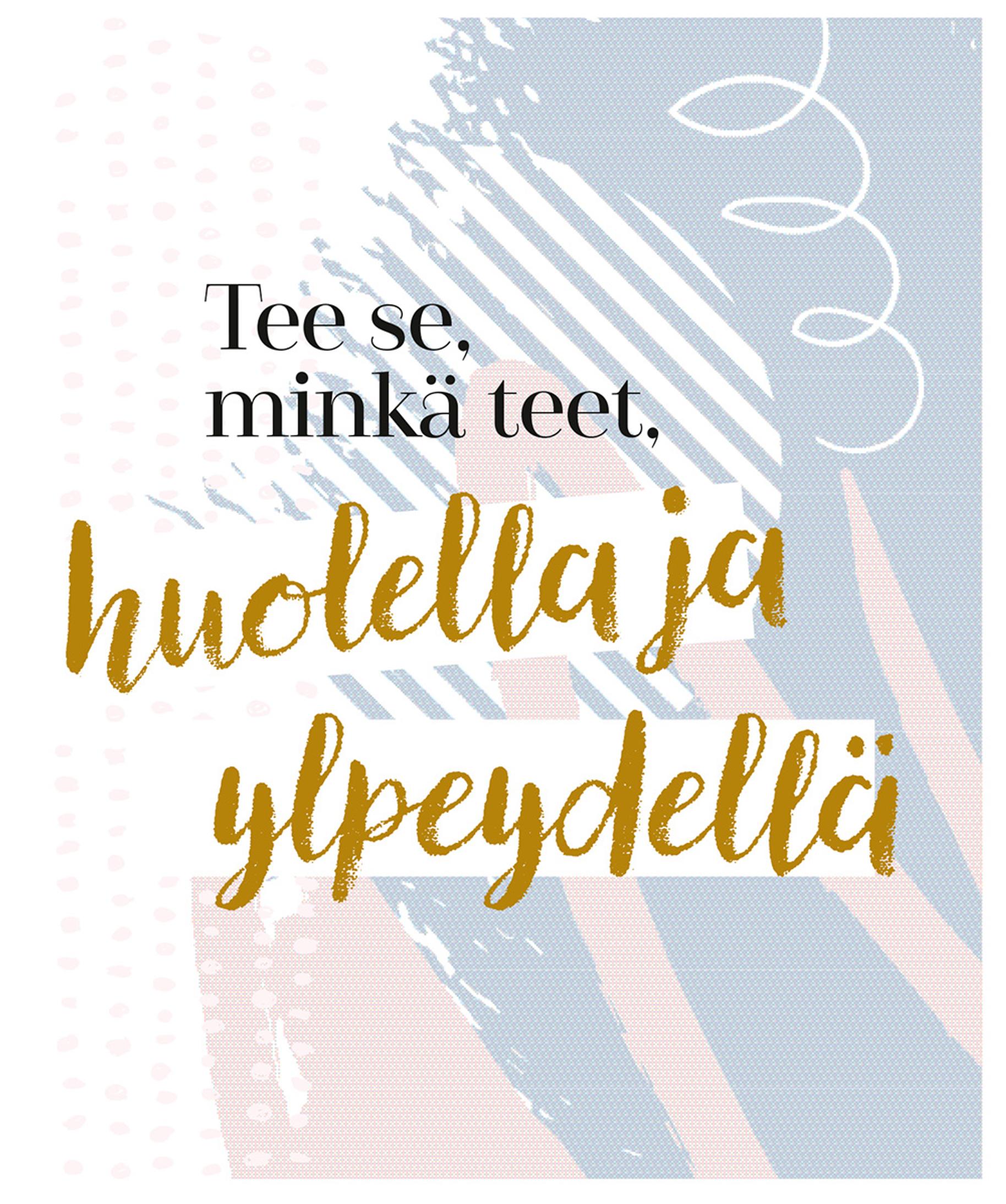 Elämänohjeellani ei ole mitään tekemistä suorittamisen tai ura-ajattelun kanssa. Se menee läpi kaikkien elämänalueiden. Käytännössä se tarkoittaa läsnäoloa ja ihmisten kohtaamista. Että tekee arkisistakin tilanteista mahdollisimman hyviä. Jos ostaa bussilipun, sen voi tehdä iloisesti ja tarttua kuskin hyväntuulisuuteen, vaikka olisi kiire. Samalla saa itselle hyvän mielen.