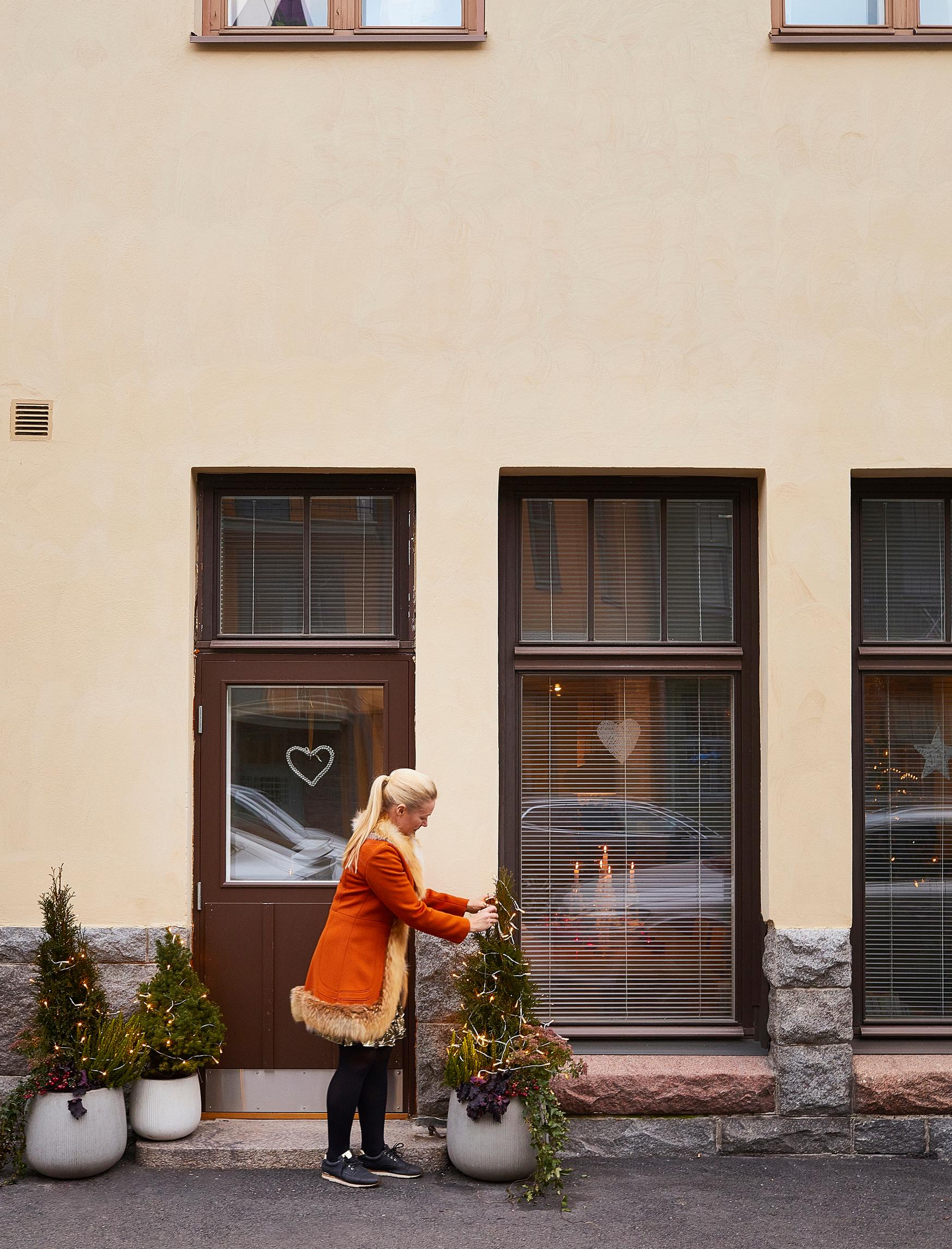 kynttilät, tuikut, havut, koristeet ja valosarjat. Somistan kotimme ulko-ovea reunustavat katajat valoilla ja laitan ikkunoille kransseja tai paperitähtiä. Kaivan esiin kaikki Kivi-tuikut ja sommittelen niitä tasoille. Kaivan ylimmistä kaapeista myös jouluiset tarjoiluastiat käyttöön. Viini- ja samppanjalasit ovat joulun aikaan kristallisia. Kotini on aika pelkistetty, joten joulutunnelma syntyy pienin lisäyksin; yksin joulukuusi tekee kodista täysin jouluisen. Myös kukat, usein valkoiset tai oranssipunaiset, kuuluvat jouluun. Suosikkejani ovat ritarinkukat, hyasintit ja ruusut.