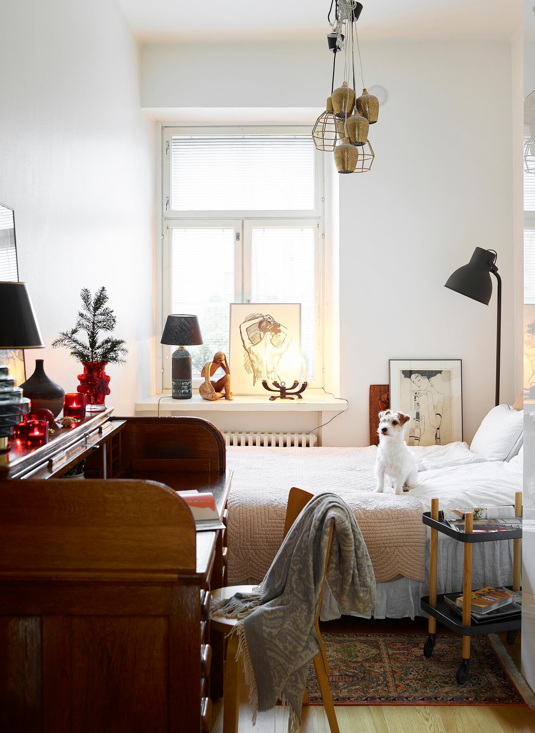 Hyödynnä vanhan rakennuksen muodot ja remontissa paljastuvat pinnat. Vuoteen pääty sujahti luontevasti seinän syvennykseen, jonka päälle syntyi taso sommitelmille.