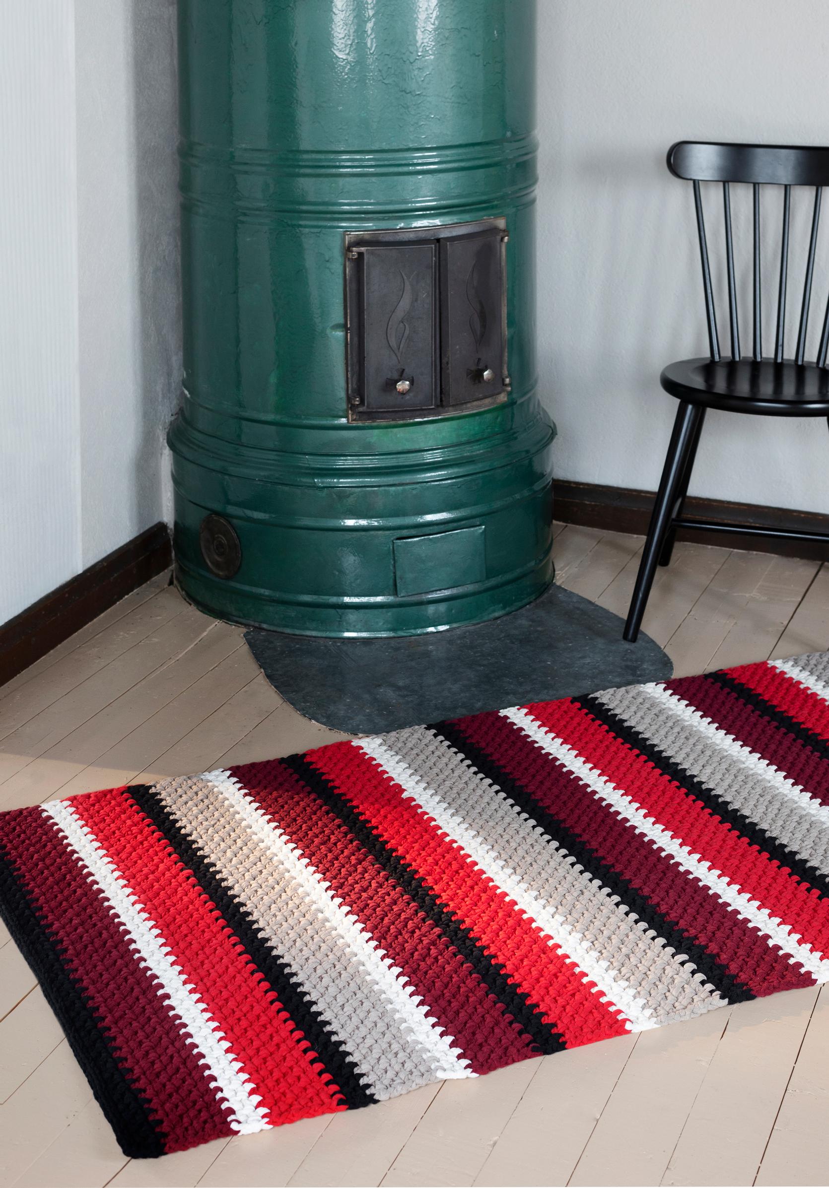 Jouluisessa raitamatossa toistuu rytmikäs kuvio. Paksusta kuteesta viidellä värillä virkattu matto on nopeasti valmis.