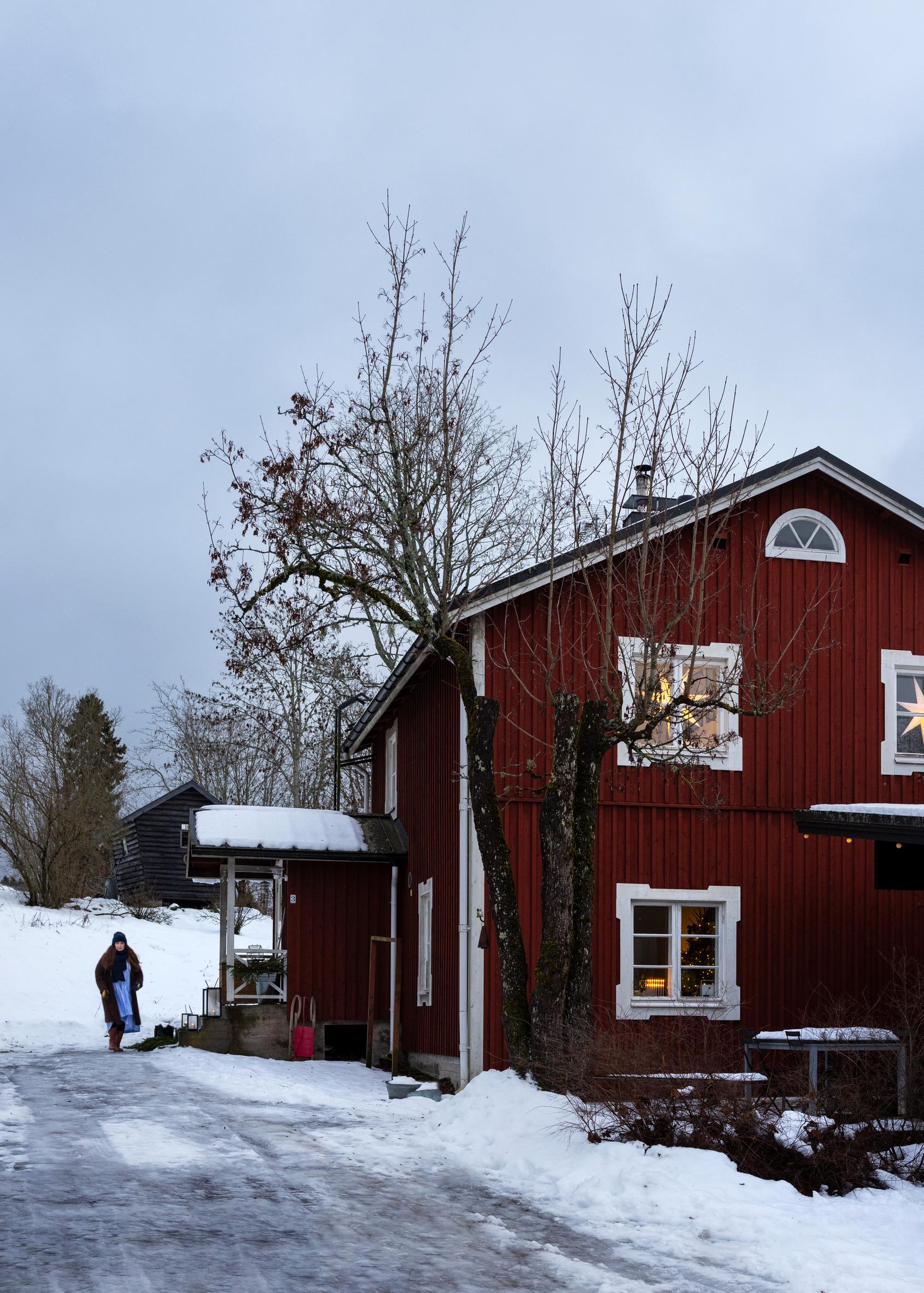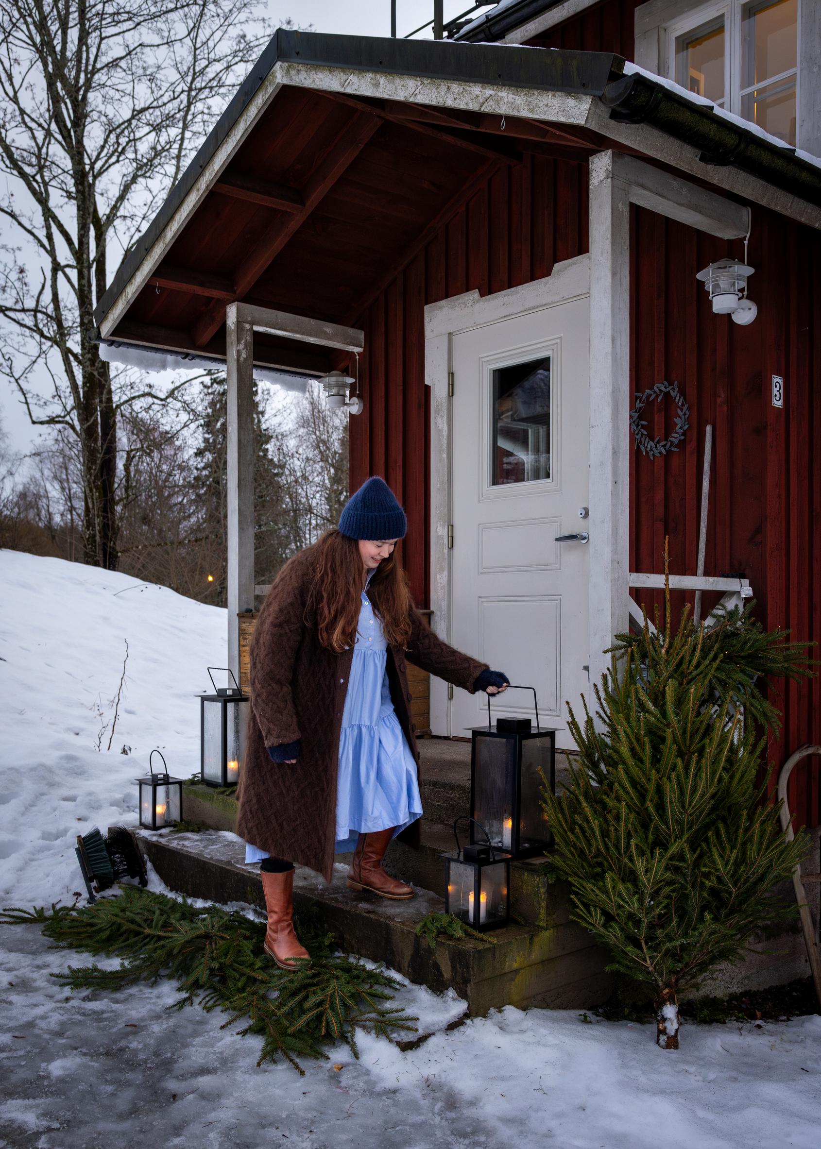 Meillä joulu alkaa näkyä pikkuhiljaa marraskuussa. Silloin ripustan jouluvalot punamullanvärisen talomme ikkunoihin. Poltamme kynttilöitä pihalyhdyissä, ja ripottelen kuusenoksia sinne tänne pihamaalle tunnelmaa luodakseni.