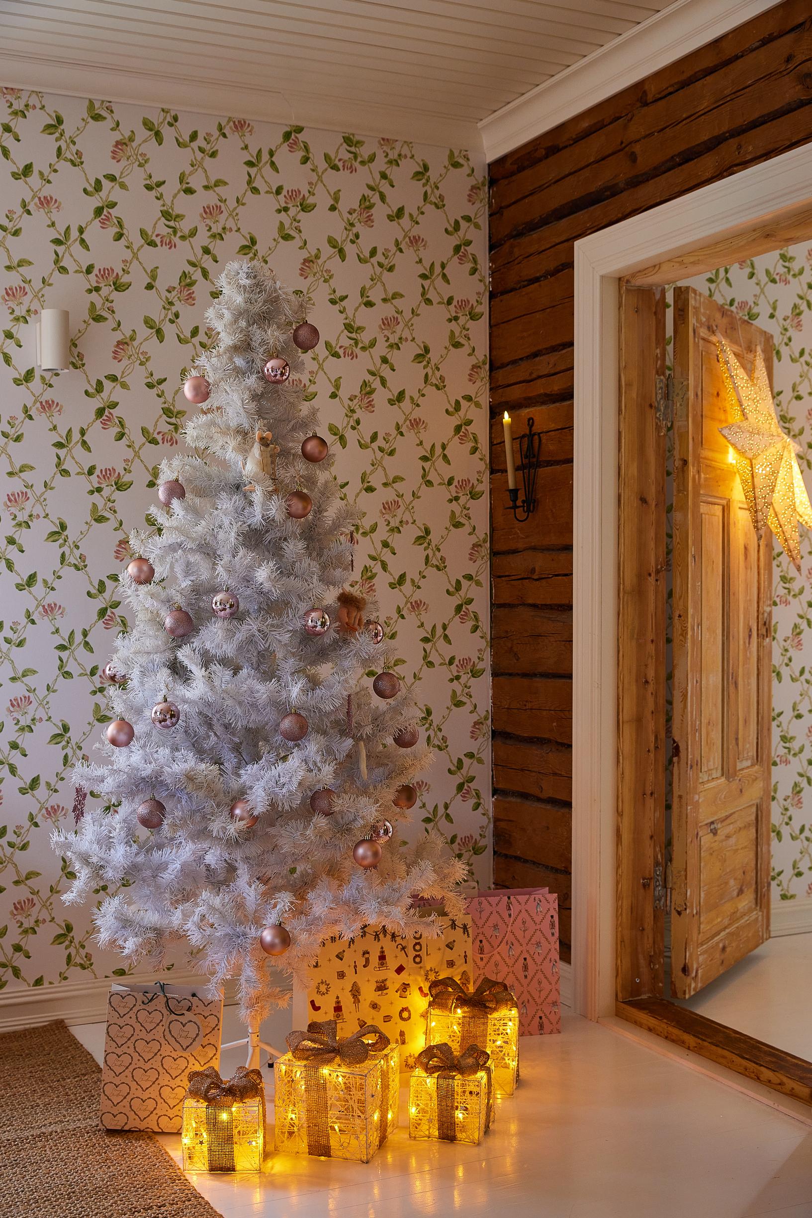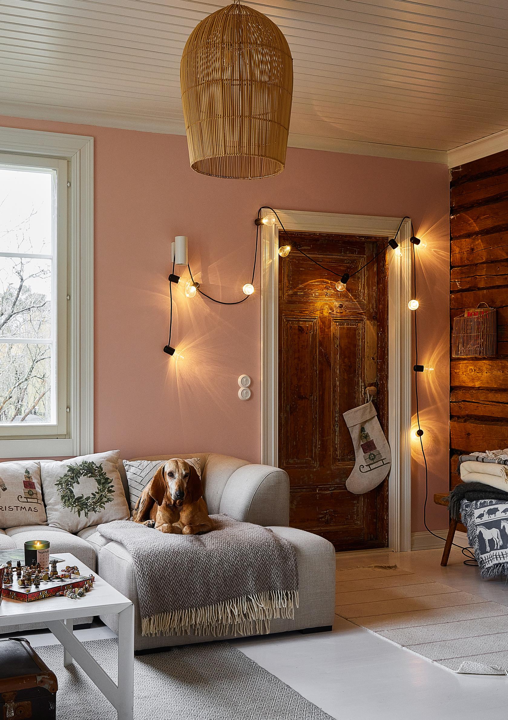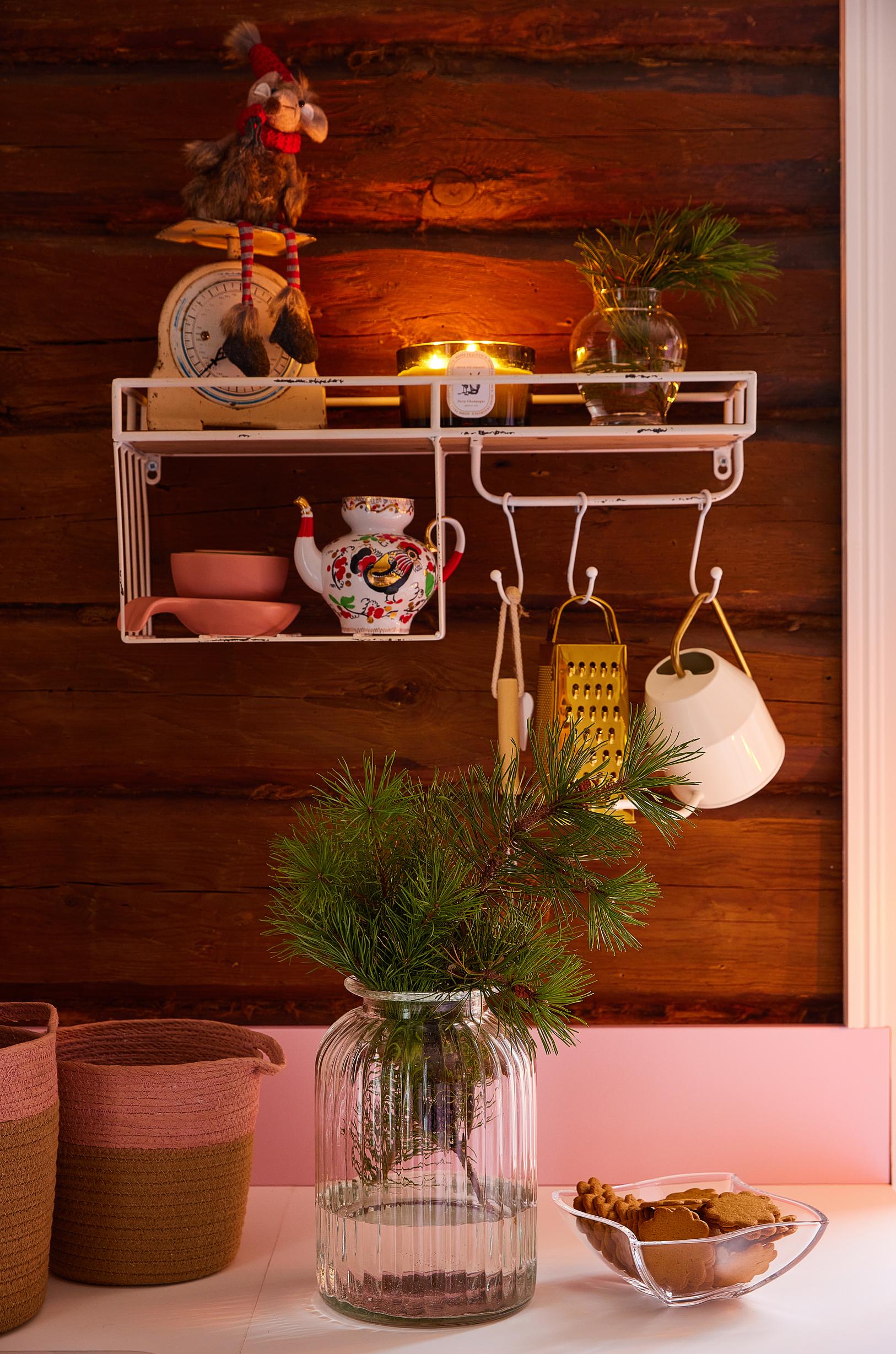 Joulun värimaailma koostuu vaaleanpunaisesta ja valkoisesta sekä vihreästä, joka toistuu maljakoihin asettelemissani havuissa. Joulu saapui Villa Vappuun jo marraskuussa, kun järjestin ystävilleni pikkujoulut. Hankin sitä varten kestokuusen, koska haluan pitää joulupuuta pitkään esillä. Sen väriksi valikoitui valkoinen, joka on näyttävä tummaa hirsiseinää vasten. Koristeet ovat vaaleanpunaisia, ja tänä jouluna olen panostanut hiirikoristeisiin. Kynttilöitä, tuiketta ja havuja – siinä joulun tunnelmaa, joka sopii tänne. Piha ja portaikko ovat täynnä lyhtyjä. Talossa on yhteensä kuusi tulipesää: kolme leivinuunia ja kolme Porin Mattia, ja ne tuovat tunnelmaa.