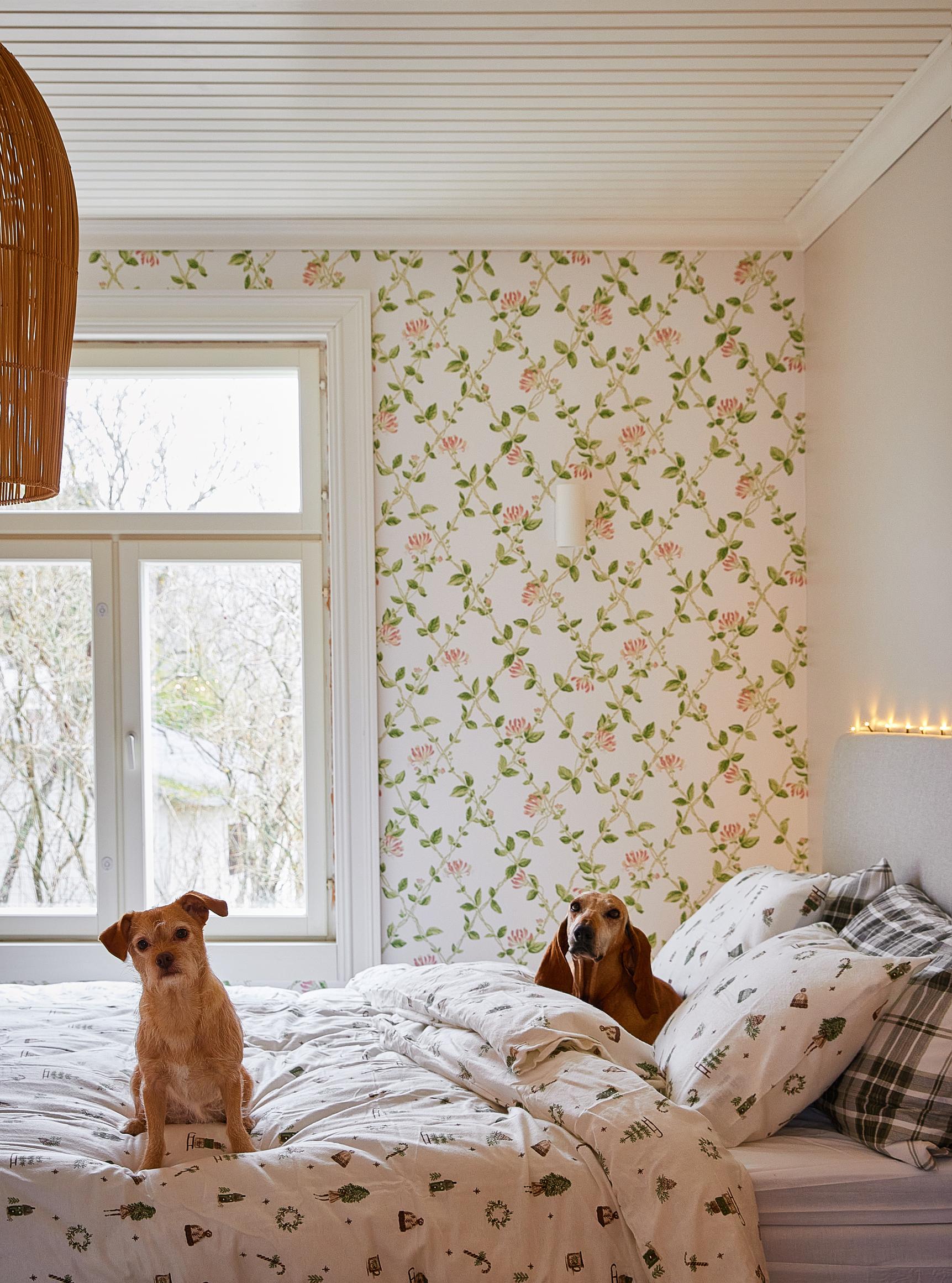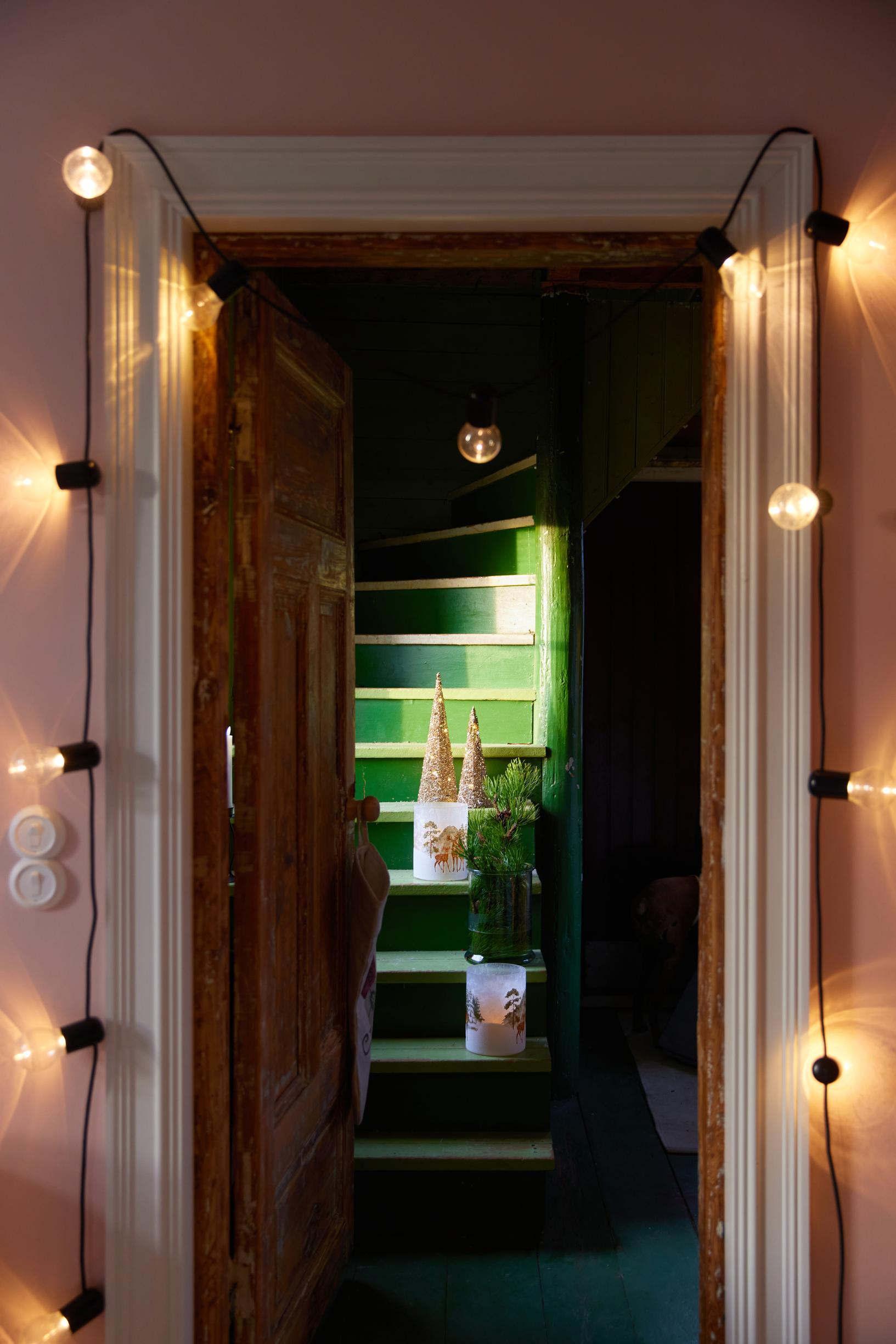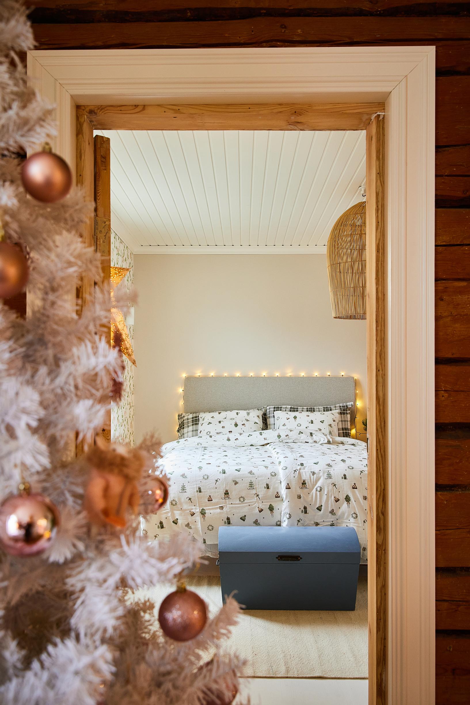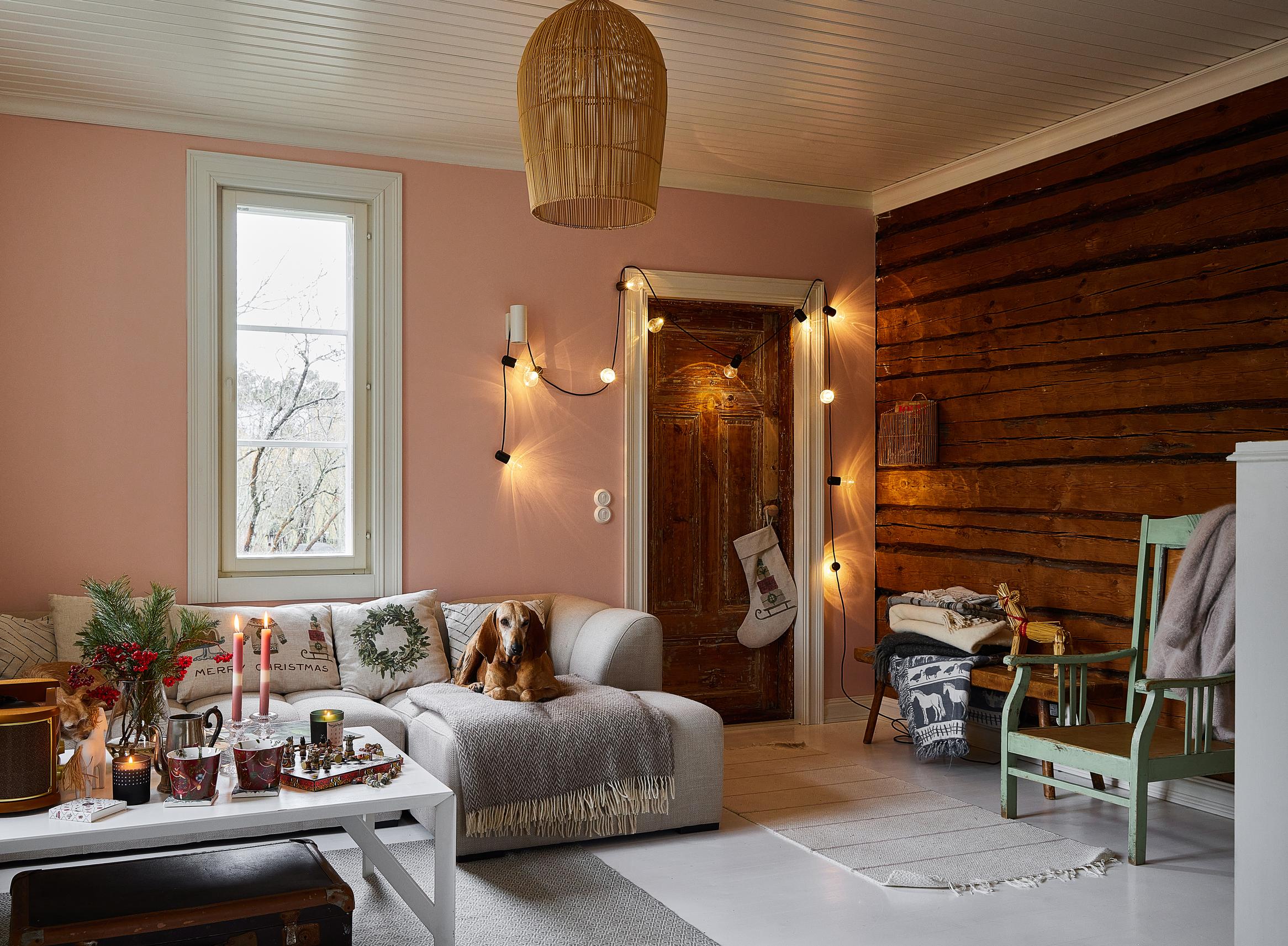 Joulun värimaailma koostuu vaaleanpunaisesta ja valkoisesta sekä vihreästä, joka toistuu maljakoihin asettelemissani havuissa. Joulu saapui Villa Vappuun jo marraskuussa, kun järjestin ystävilleni pikkujoulut. Hankin sitä varten kestokuusen, koska haluan pitää joulupuuta pitkään esillä. Sen väriksi valikoitui valkoinen, joka on näyttävä tummaa hirsiseinää vasten. Koristeet ovat vaaleanpunaisia, ja tänä jouluna olen panostanut hiirikoristeisiin. Kynttilöitä, tuiketta ja havuja – siinä joulun tunnelmaa, joka sopii tänne. Piha ja portaikko ovat täynnä lyhtyjä. Talossa on yhteensä kuusi tulipesää: kolme leivinuunia ja kolme Porin Mattia, ja ne tuovat tunnelmaa.