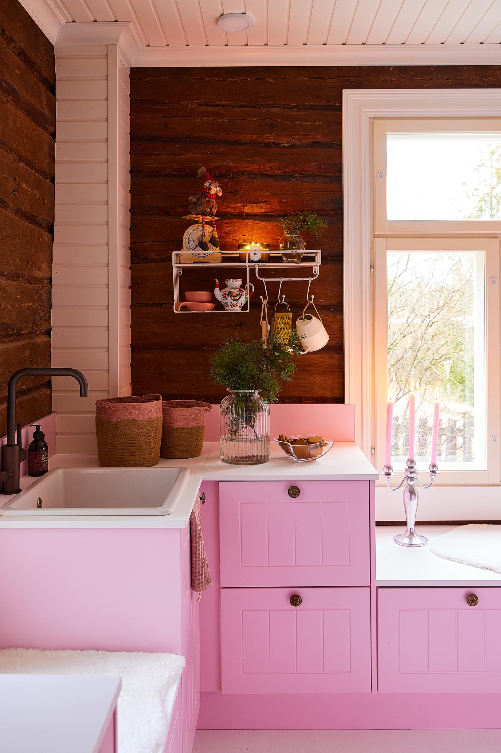 Talo oli kuin 40-vuotislahja minulle, toteutunut haave. Olin aina unelmoinut vaaleanpunaisesta keittiöstä, ja sekin on nyt täällä. Koska taloon tulijat kulkevat keittiön kautta, mielestäni oli tärkeää tehdä tilastä näyttävä. Valitsin kaappien maalisävyn kymmenistä vaaleanpunaisen vaihtoehdoista, ja mielestäni onnistuin hyvin. Sävy on kuin mansikkapirtelö. Hauska detalji ovat entisen puukeittiön vetimet, jotka liotin ja puhdistin. Jotain vanhaa ja jotain uutta.