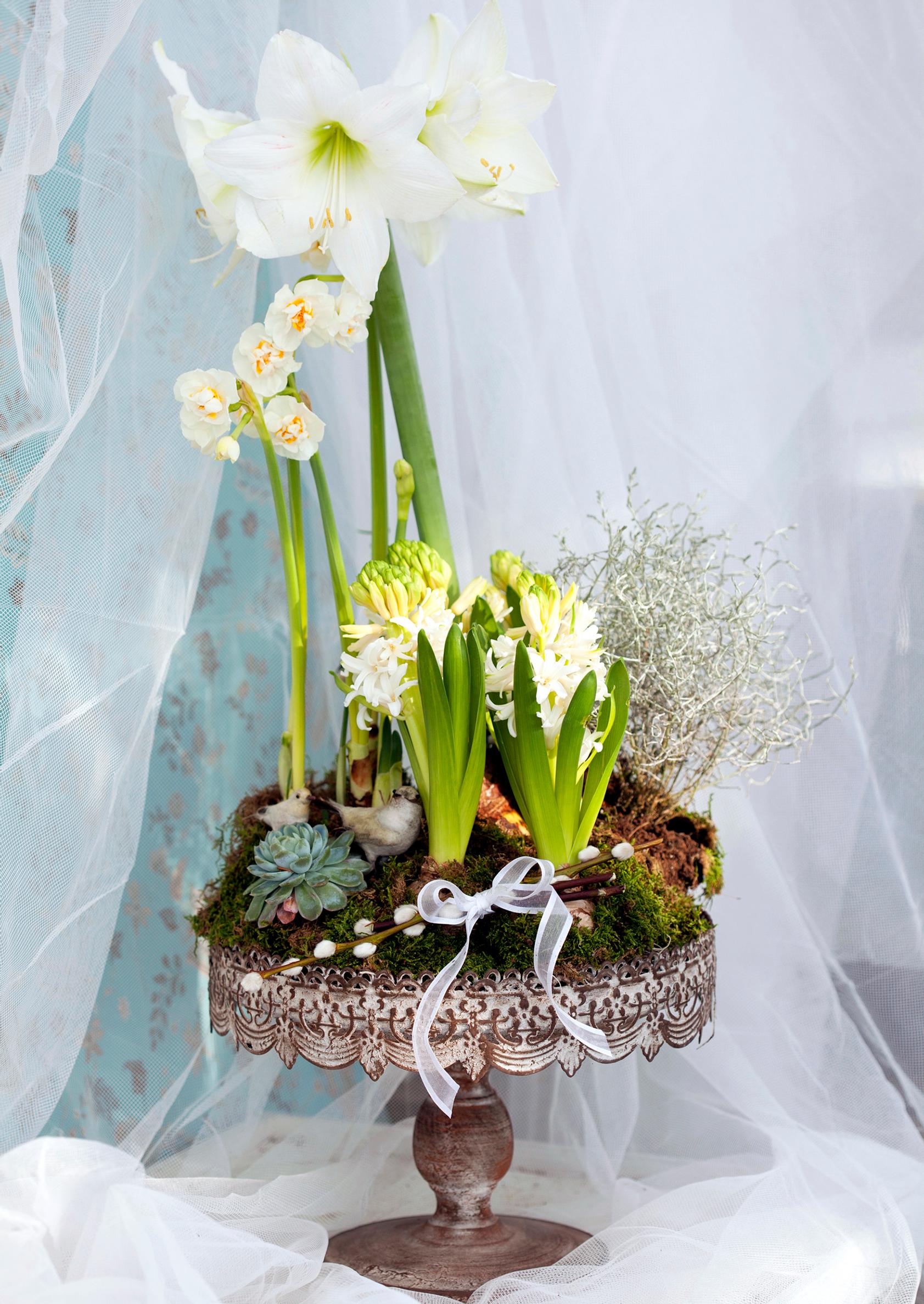 Tee jalalliseen kakkuvatiin juhlava joulukukka-asetelma sipulikukista ja sammaleesta.