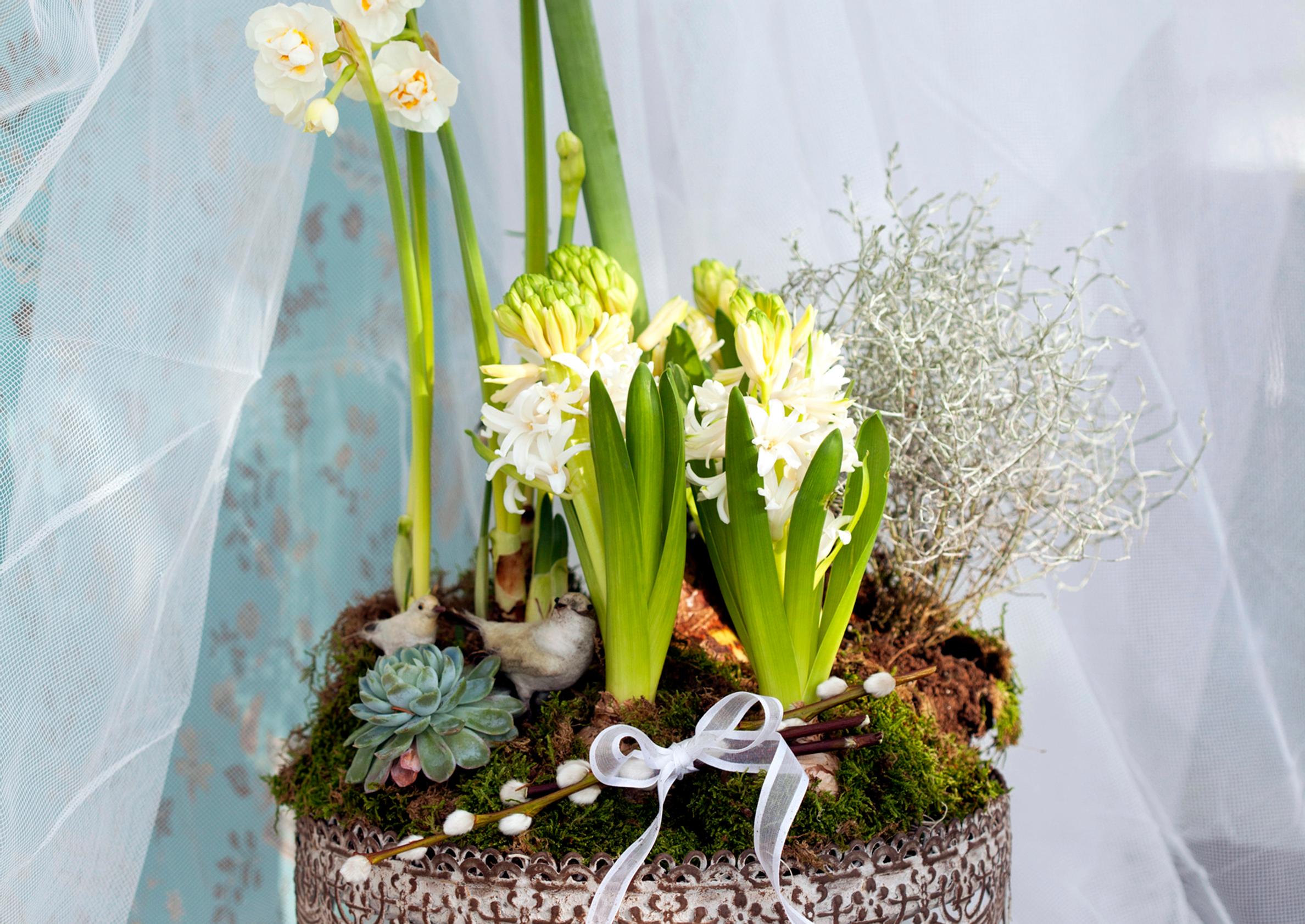 2. Aloita asetelman teko korkeimmista kasveista. Malliasetelmassa ritarinkukka on takimmaisena, tasetit sen vierellä. Hyasintit ovat etualalla ja hopealanka ja mehitähti sen molemmin puolin. Jos kasvit eivät meinaa pysyä paikoillaan, käytä metallilankaa apuna sitomisessa.